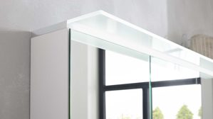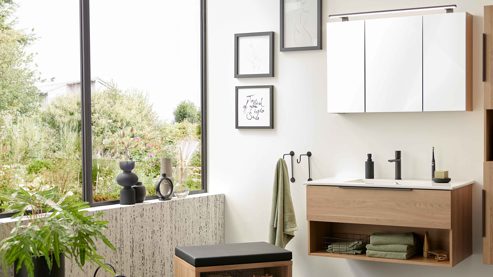 Die Abbildung zeigt ein Wohnbeispiel, welches auch Dekoration sowie separat erhältliches Zubehör enthält. Im Lieferumfang enthalten sind zwei Hängeschränke, ein Spiegelschrank ohne Aufsatzleuchte und Steckdose, ein Waschbecken, eine schwarze Armatur, zwei schwarze Handtuchhalter und ein Waschbeckenunterschrank.