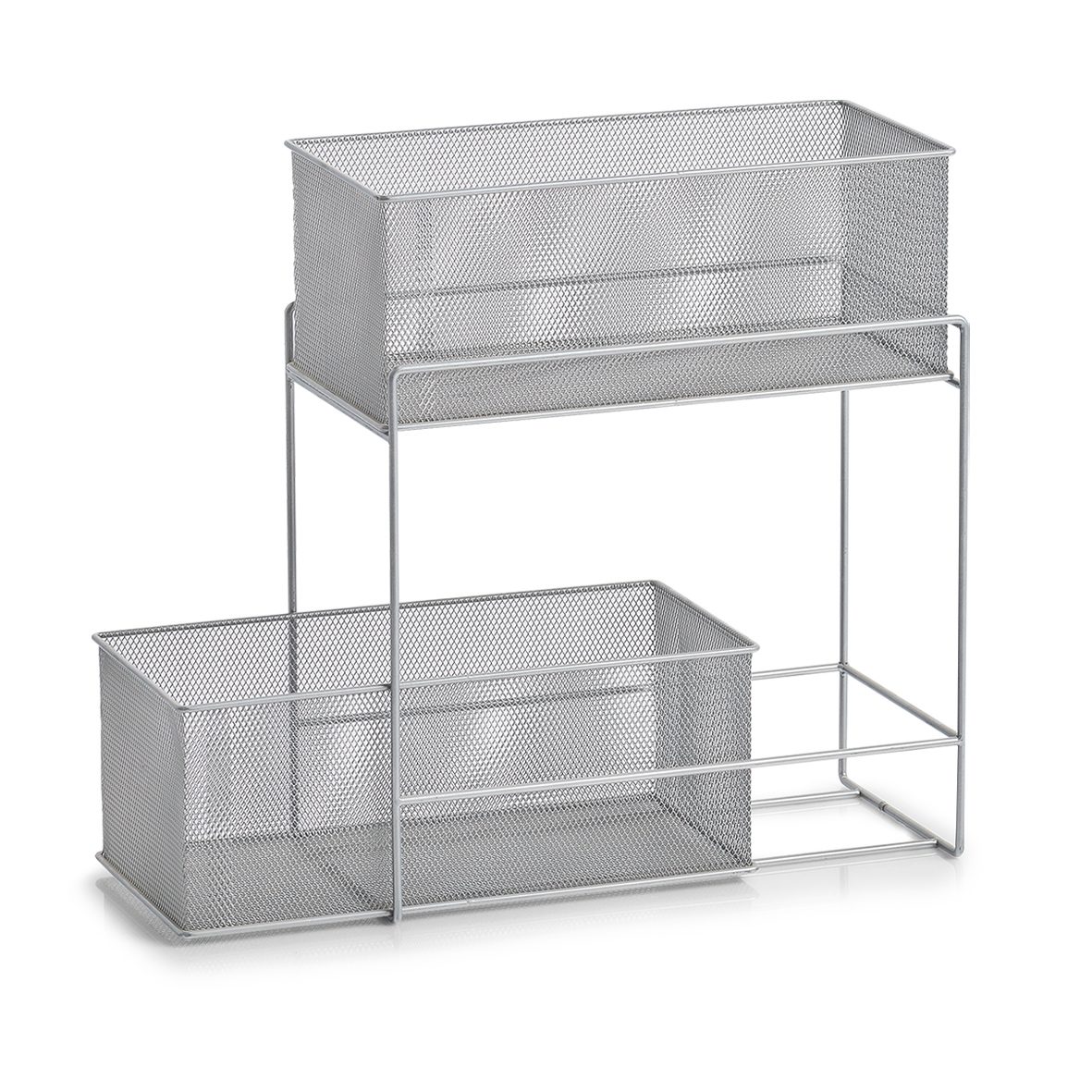 Dank diesem praktischen Etagenregal aus Stahlgeflecht mit zwei Körben aus Mesh gewinnen Sie wertvollen Stauraum in Ihrem Zuhause. Es schafft Ordnung in Ihren Schränken und Regalen und eignet sich ideal für den Einsatz in den Küchen-, Vorrats- oder Badschränken.
