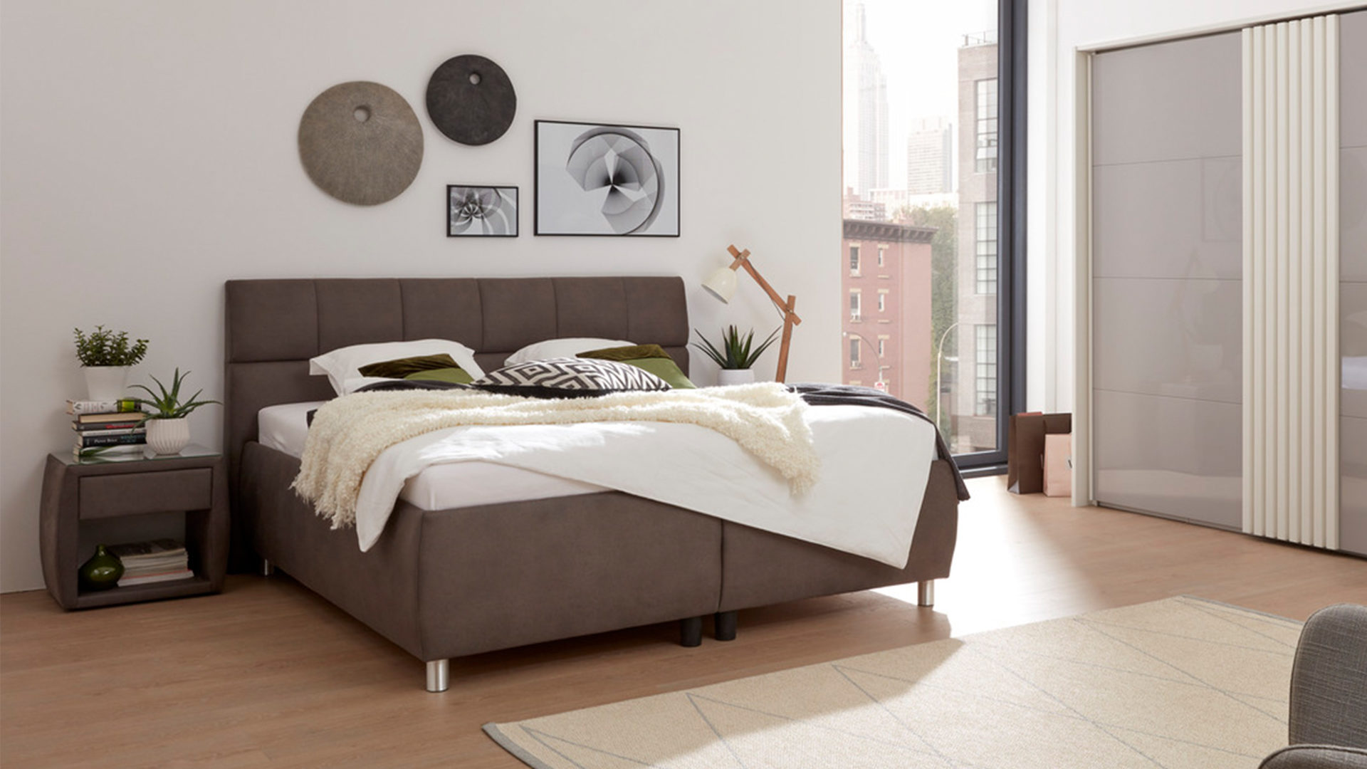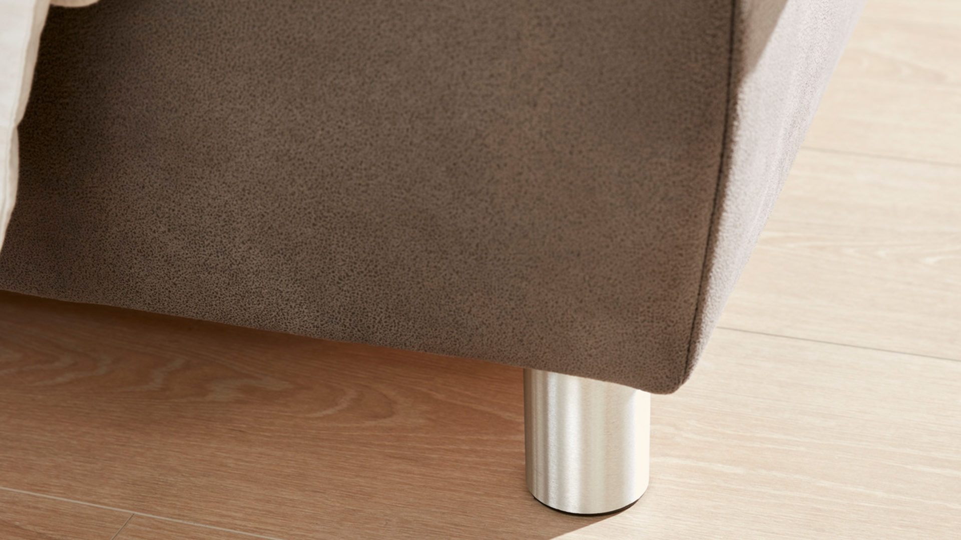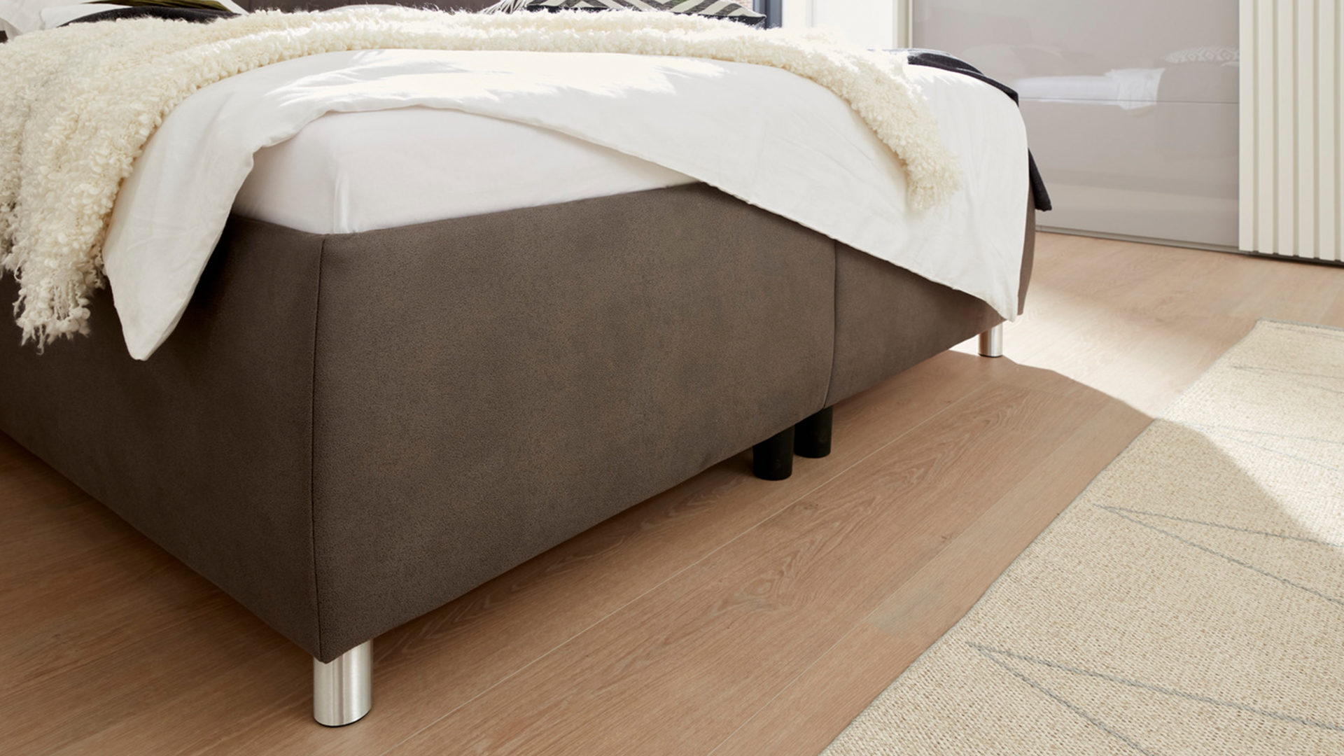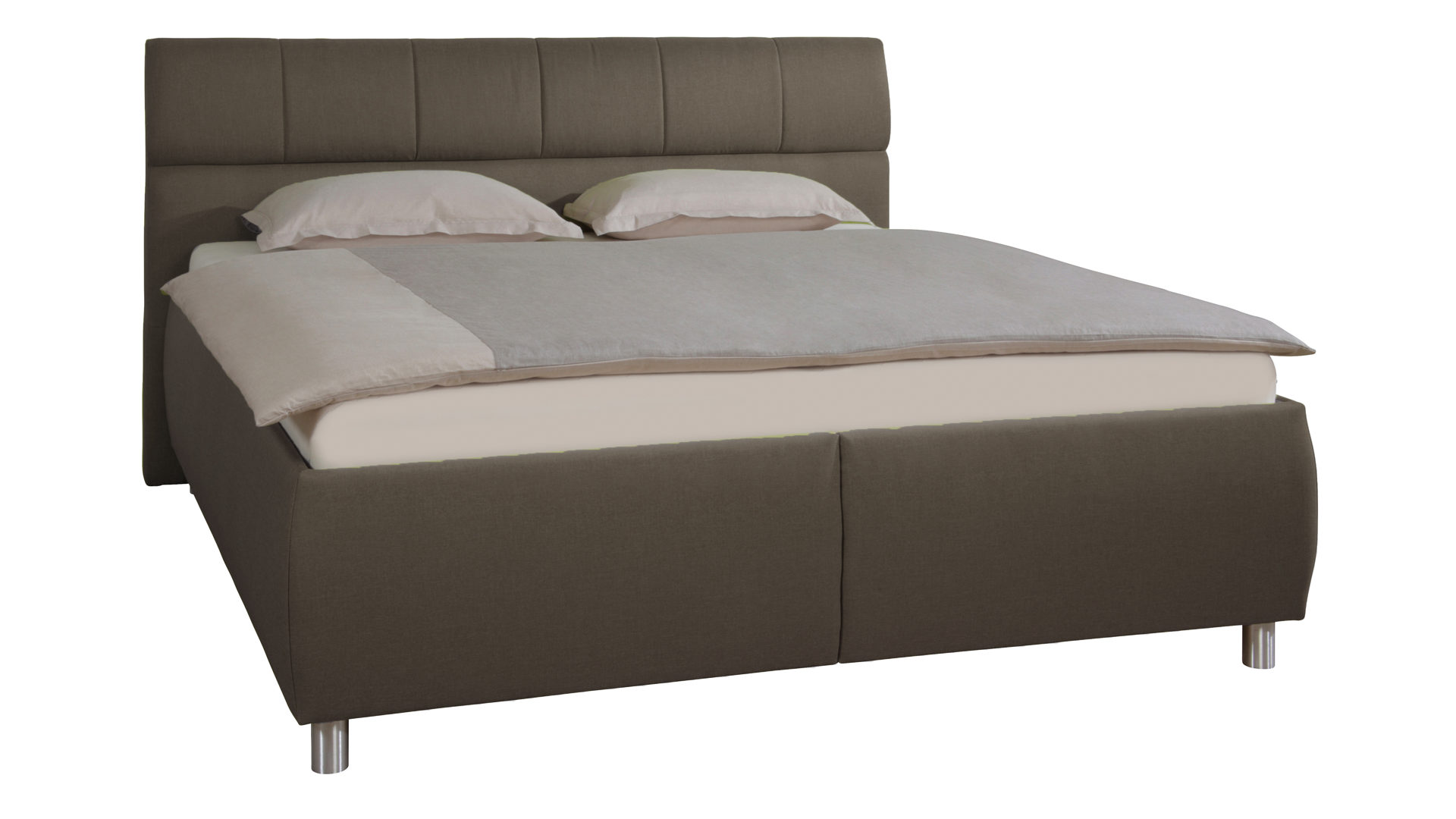 Das edle Polsterbett Malea kombiniert alufarbene Füße als schlicht-robuste Basis mit einem klassisch-braunen Stoffbezug. Zusammen sorgen die Materialien und Farben für eine moderne, elegante und auch warme Ausstrahlung. Das Polsterkopfteil mit schicker Steppung bildet einen optischen wie funktionalen Höhepunkt.