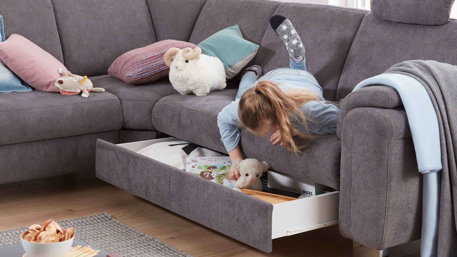 Die Stauraum-Schublade ist ein praktischer Funktions-Mehrpreis für diverse Möbel aus dem Modulmaster-Polsterprogramm MM-ZE1002. Mit der gepolsterten und im Originalstoff bezogenen Front fügt sie sich nahtlos ins Gesamtbild ein. Die innen weiß beschichtete sowie gut belüftete Schublade eignet sich zur Aufbewahrung von Wohntextilien, Spielsachen und anderen Gegenständen.