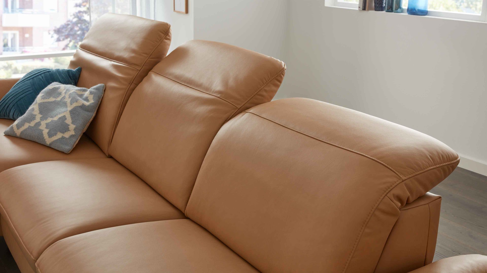 Die Kopfteilverstellung KV mit Faltenoptimierung ist ein Funktions-Mehrpreis für verschiedene Möbel aus der Modulmaster-Polsterserie MM-PN1161. Mittels Rasterbeschlag können Sie das Kopfteil manuell mehrfach in der Neigung verstellen, sodass die Gesamthöhe der jeweiligen Couch von ca. 85 bis 110 cm variiert.