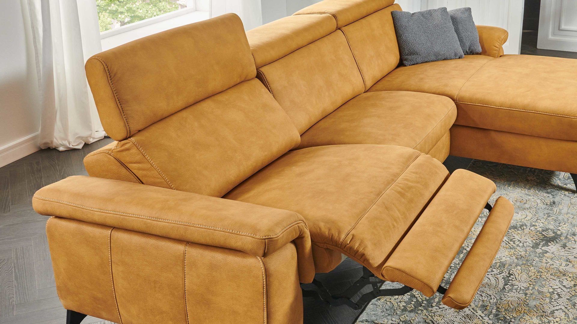 Über zwei Motoren und mittels Kabel-Handschalter lassen sich Rückenlehne, Sitz und Fußstütze des jeweiligen Polstermöbels auf Knopfdruck stufenlos verstellen. In der Endposition können Sie Ihre Beine komplett ausstrecken und beim Fernsehen oder Lesen auf dem Sofa besonders entspannt sitzen.