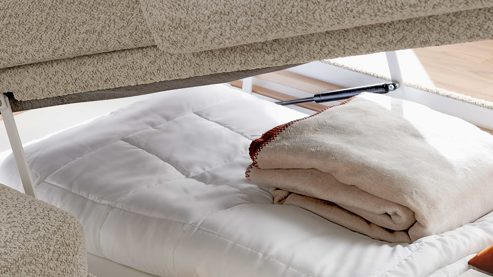 Die Sitzfläche lässt sich dank integrierter Gasdruckfeder besonders leicht und komfortabel nach oben öffnen. So öffnest du den Bettzeugraum mühelos und sicher. Im Inneren befindet sich ein pflegeleicht weiß beschichteter Stauraum, der robust, strapazierfähig und einfach zu reinigen ist.