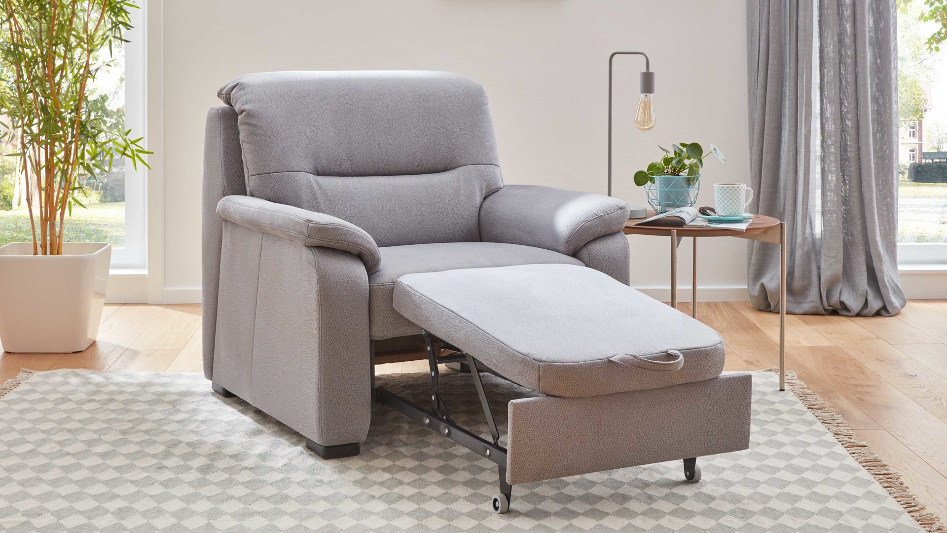 • Die Abbildung zeigt ein Wohnbeispiel, welches auch Dekoration sowie separat erhältliches Zubehör enthält. Im Lieferumfang enthalten ist der Sessel mit Hocker.