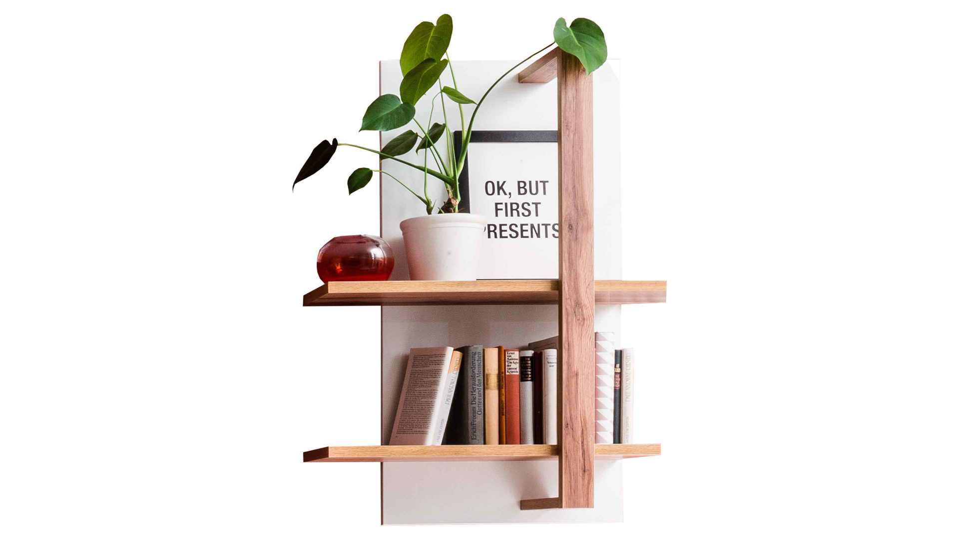 Das Wandregal 52 aus dem modernen Wohnprogramm Cali verbindet kratz- und stoßfeste, weiße Melaminoberflächen mit Wotan Eiche-Nachbildung - und dadurch puristische Eleganz mit natürlich anmutendem Charme.