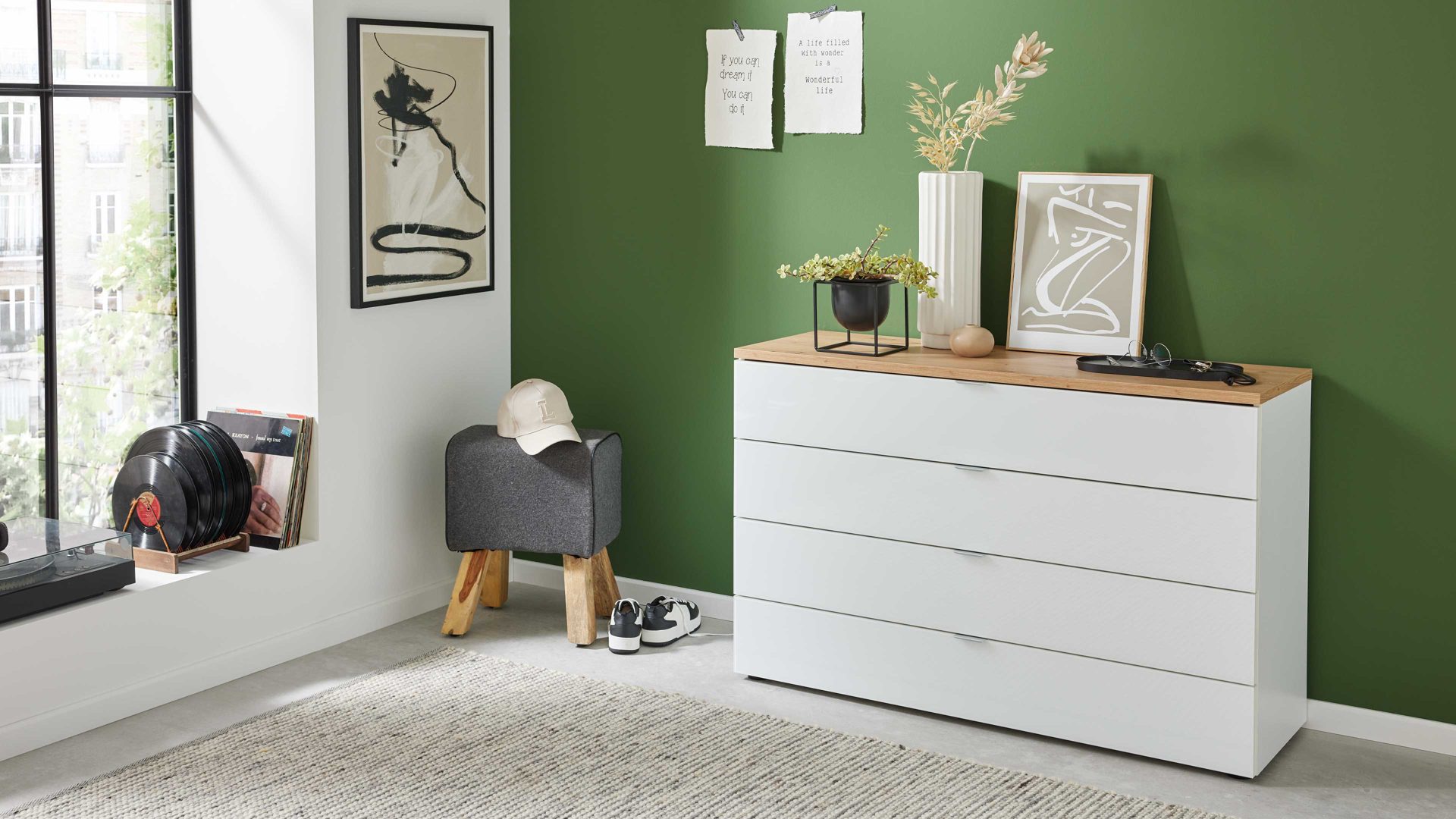 Schubladenkommode aus der Interliving Kleiderschrank Serie 1208 – stilvolle Kombination aus Alpinweiß und Artisan-Eiche