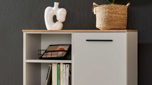 Auf der linken Seite findest du ein offenes Fach mit höhenverstellbarem Einlegeboden sowie zwei praktische Schubladen. Hier kannst du flexibel zwischen offener Präsentation und geschlossener Aufbewahrung wählen. Rechts ergänzt eine Tür mit zwei höhenverstellbaren Einlegeböden den Stauraum – ideal für größere Gegenstände oder ordentlich gestapelte Wäsche.