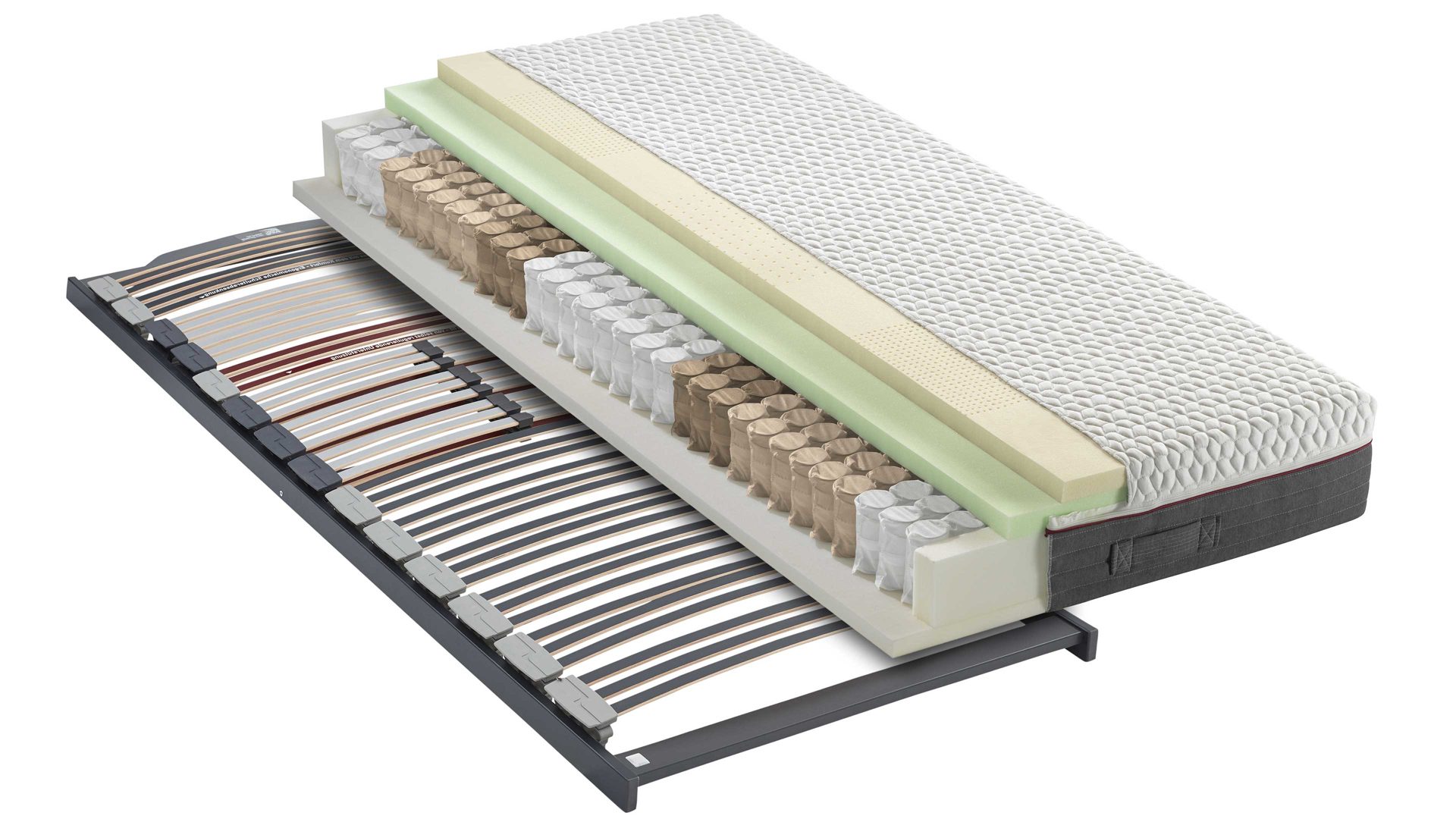 Eine ca. 4 cm dicke Komfort-Zwischenlage aus aerDURA®-Softschaum sorgt für sanfte Druckentlastung und verbessert die Klimaregulierung der Matratze deutlich. Die ebenfalls ca. 4 cm dicke Softlatex-Komfortauflage ergänzt das System perfekt: Sie ist besonders anpassungsfähig, langlebig, reguliert Feuchtigkeit und Wärme zuverlässig und besteht zu ca. 50 % aus natürlichen, nachwachsenden Rohstoffen. Das Ergebnis ist ein wohlig ausgeglichenes, angenehm schwebendes Liegegefühl.