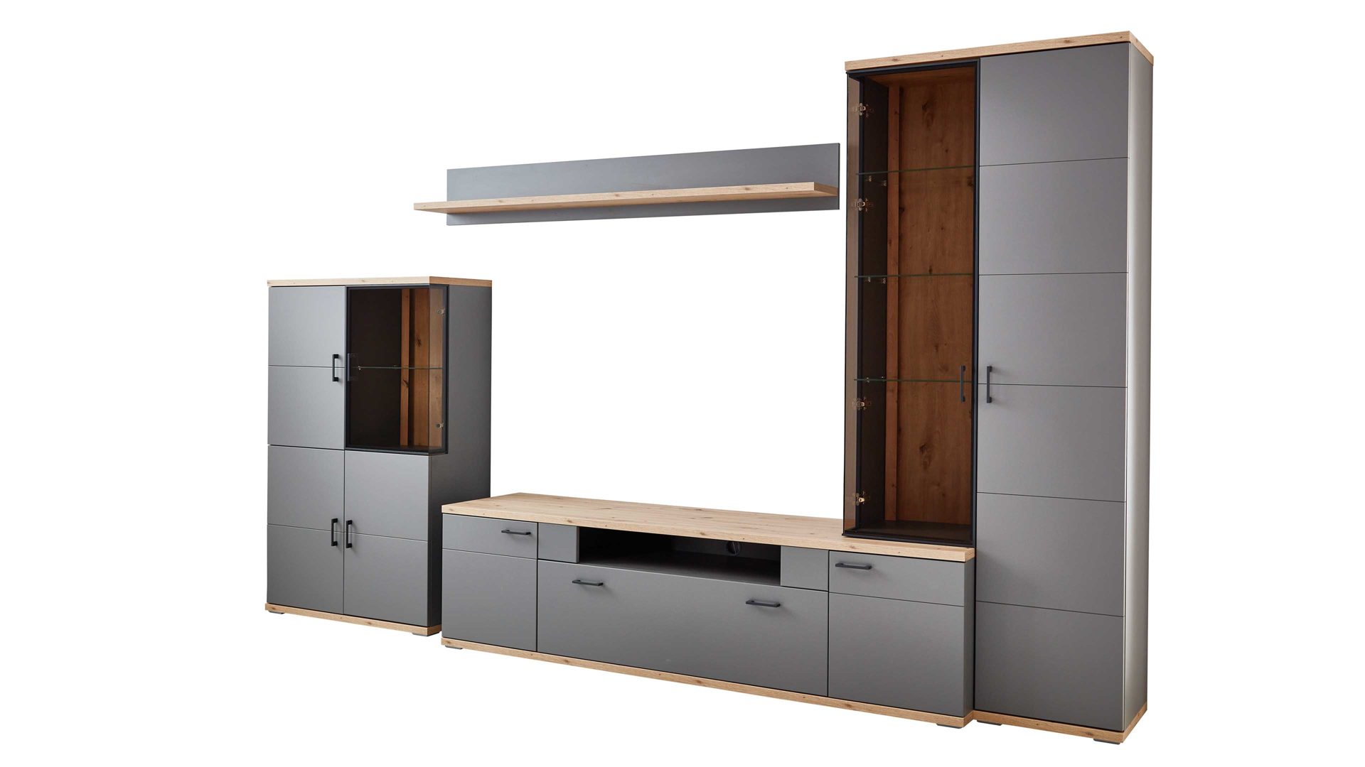 Erleben Sie das einzigartige Wohngefühl mit der Wohnwand Houton. Mit ihren grauen Kunststoff-Oberflächen strahlt sie eine zeitlose Eleganz aus, die in jedem Raum für einen stilvollen Blickfang sorgt.  Der Korpus verfügt über graue Melaminoberflächen, die nicht nur stoß- und kratzfest, sondern auch lichtbeständig sind. Die  Absetzungen in Dekor Eiche Artisan verleihen der Anbauwand einen natürlichen Touch und sorgen für Gemütlichkeit. Die sichtbaren Rückwände in Optik Eiche sandgestrahlt setzen zudem spannende Akzente.