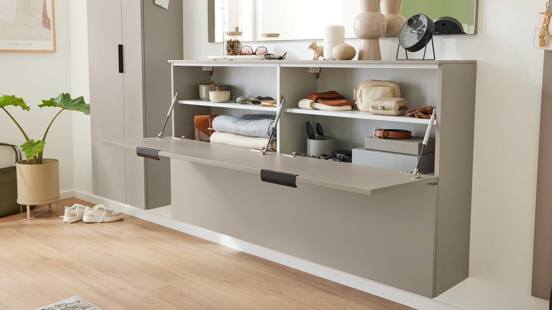 Dank der wandhängenden Konstruktion wirkt die Dielenkommode besonders leicht und elegant – und lässt dabei auch noch Raum für die unkomplizierte Bodenreinigung.