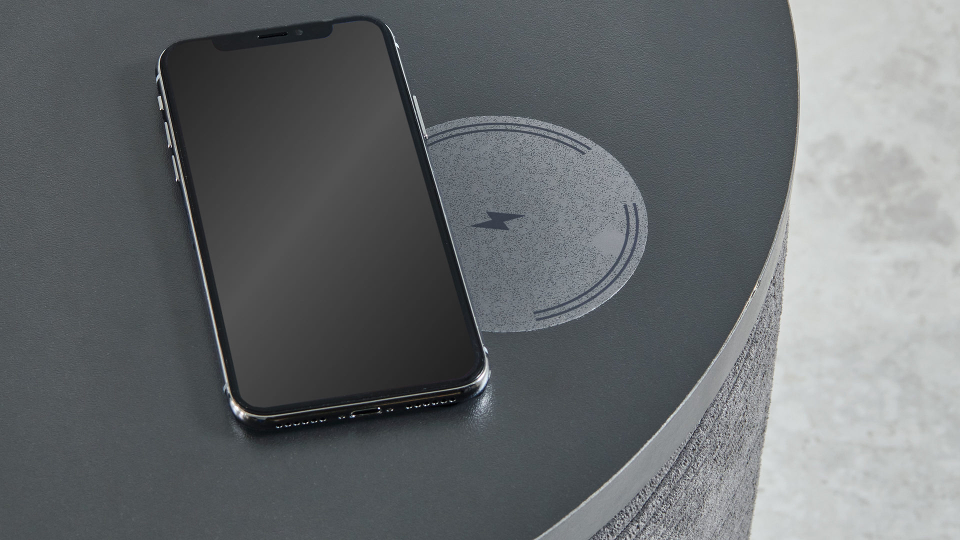 Sie besteht aus einem mit anthrazitfarbenem Feincord bezogenen Holzkorpus, schwarzen Kunststoffgleitern und einem akzentuierenden Oberboden mit schwarzer Oberfläche, auf dem Sie beispielsweise Platz für eine Nachttischlampe und Ihre aktuelle Abendlektüre haben. Sowohl der Durchmesser als auch die Höhe des Nachttisches belaufen sich auf ca. 48 cm. Der Clou ist die Induktionsfläche, auf der Sie ganz bequem Ihr Smartphone aufladen können.