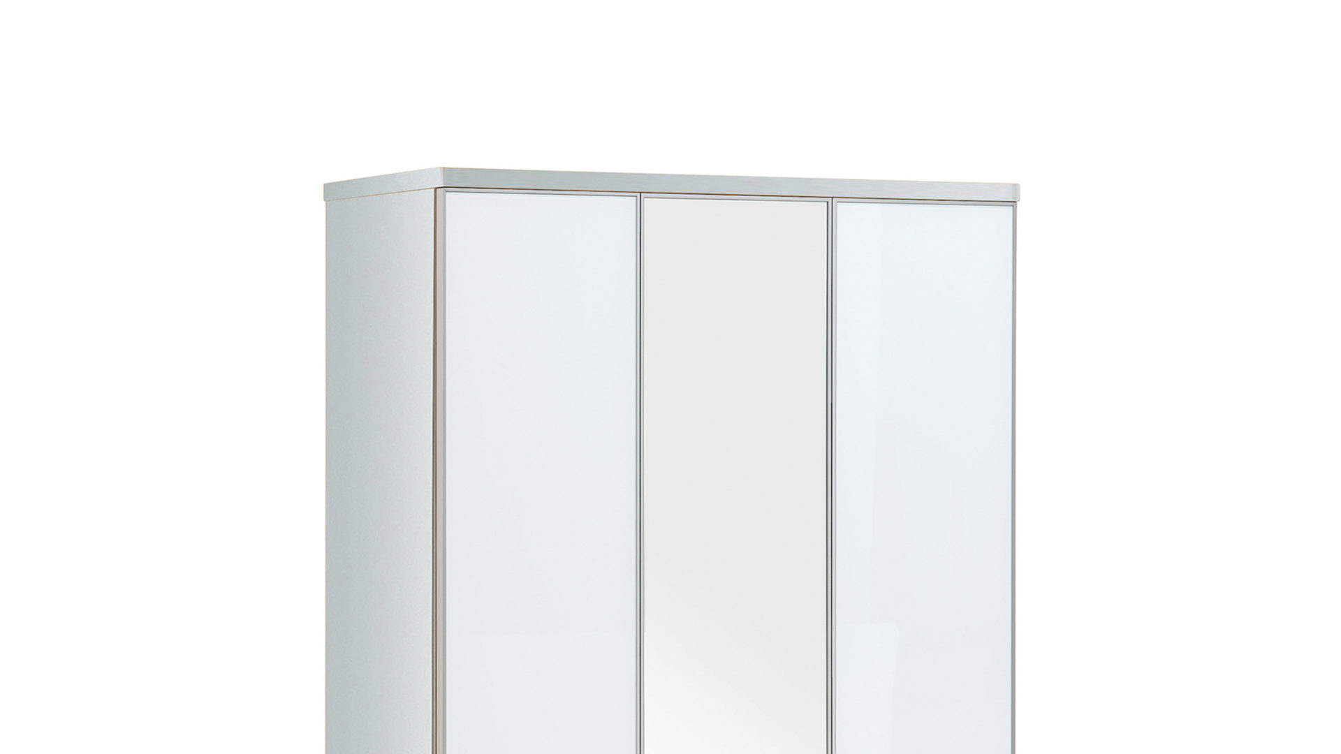 Der Garderobenschrank hat einen weiß lackierten Korpus und optiweiße Glasfronten mit einer Spiegelauflage. Hinter der linken Holztür verstecken sich sieben Schuhgitter, die Stiefel, High Heels und Turnschuhe geschmackvoll aufbewahren, auf der anderen Seite erwartet Sie ein großes Fach, in dem Sie Jacken und Mäntel aufbewahren können.