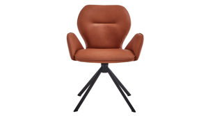 Er kombiniert ein mattschwarz lackiertes Stativgestell aus robustem Eisen mit einem cognacfarbenen Mikrofaserbezug in Lederoptik und fügt sich in verschiedene Wohnstile harmonisch ein. Zu den optischen Highlights des Esszimmerstuhls gehört neben der Formensprache und den perfekt aufeinander abgestimmten Farben der markante Quereinzug im Rücken.