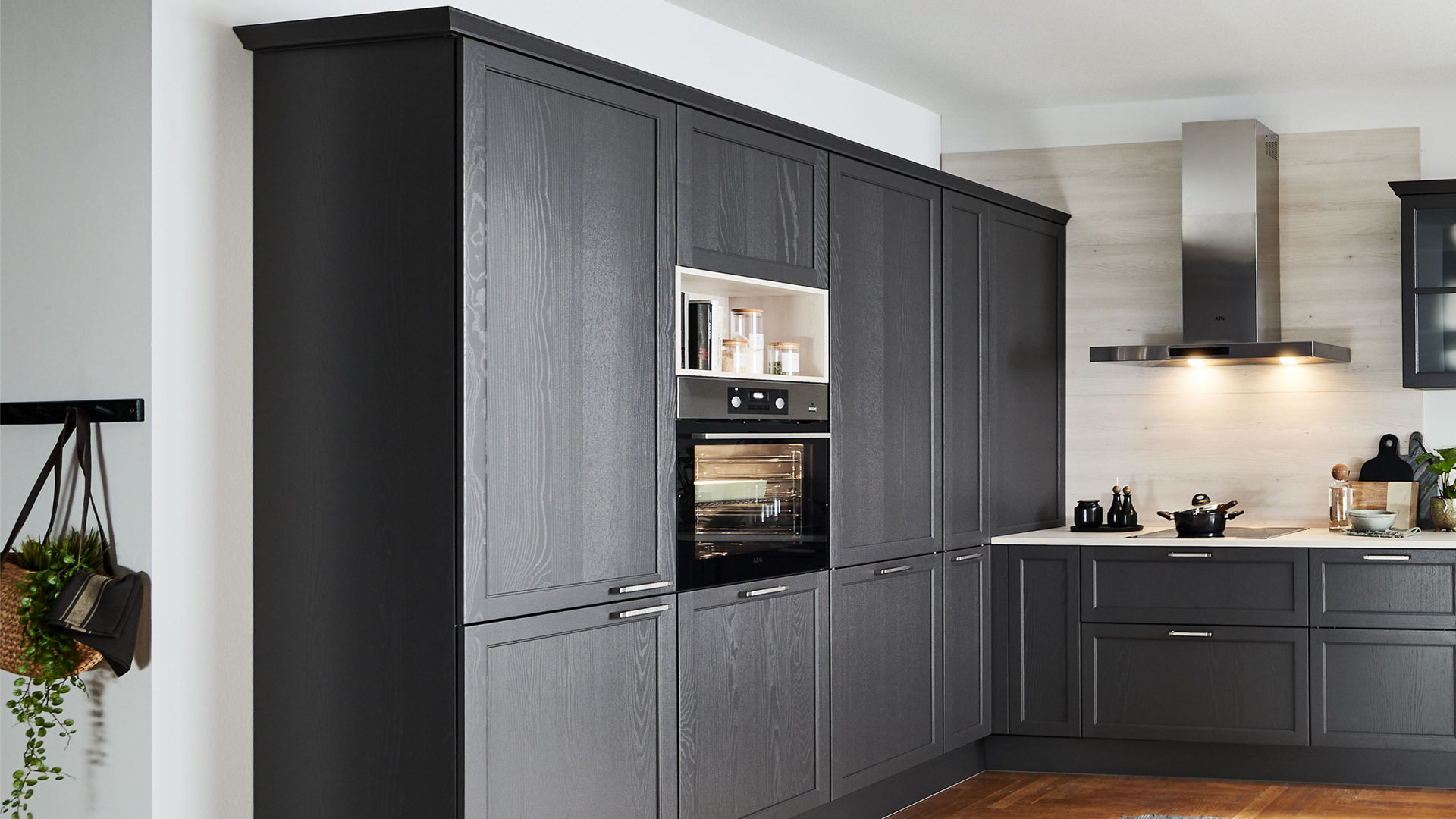 Diese Einbauküche im modernen Landhausstil verbindet klassische Formensprache mit zeitgemäßer Funktionalität. Softmatt graphitfarben lackierte Eschenholzfronten mit sichtbarer Maserung verleihen der Küche eine besonders edle Ausstrahlung. Der Massivholzrahmen mit furnierter Füllung unterstreicht die hochwertige Verarbeitung, während edelstahlfarbene Metallgriffe stilvolle Akzente setzen. Arbeitsplatte und Regalfach in Kiruna Birke-Nachbildung sorgen für eine warme, natürliche Ergänzung.