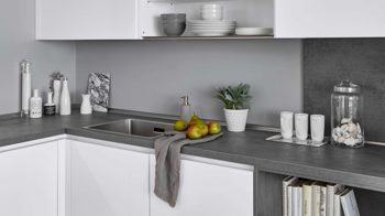 Arbeitsplatten, Nischenverkleidung und ein offenes Regalelement in schiefergrauer Beton-Nachbildung setzen markante Kontraste und verleihen der Küche eine urbane Note. Das Zusammenspiel aus strahlendem Weiß und dunklen Akzenten schafft ein zeitloses, elegantes Gesamtbild.