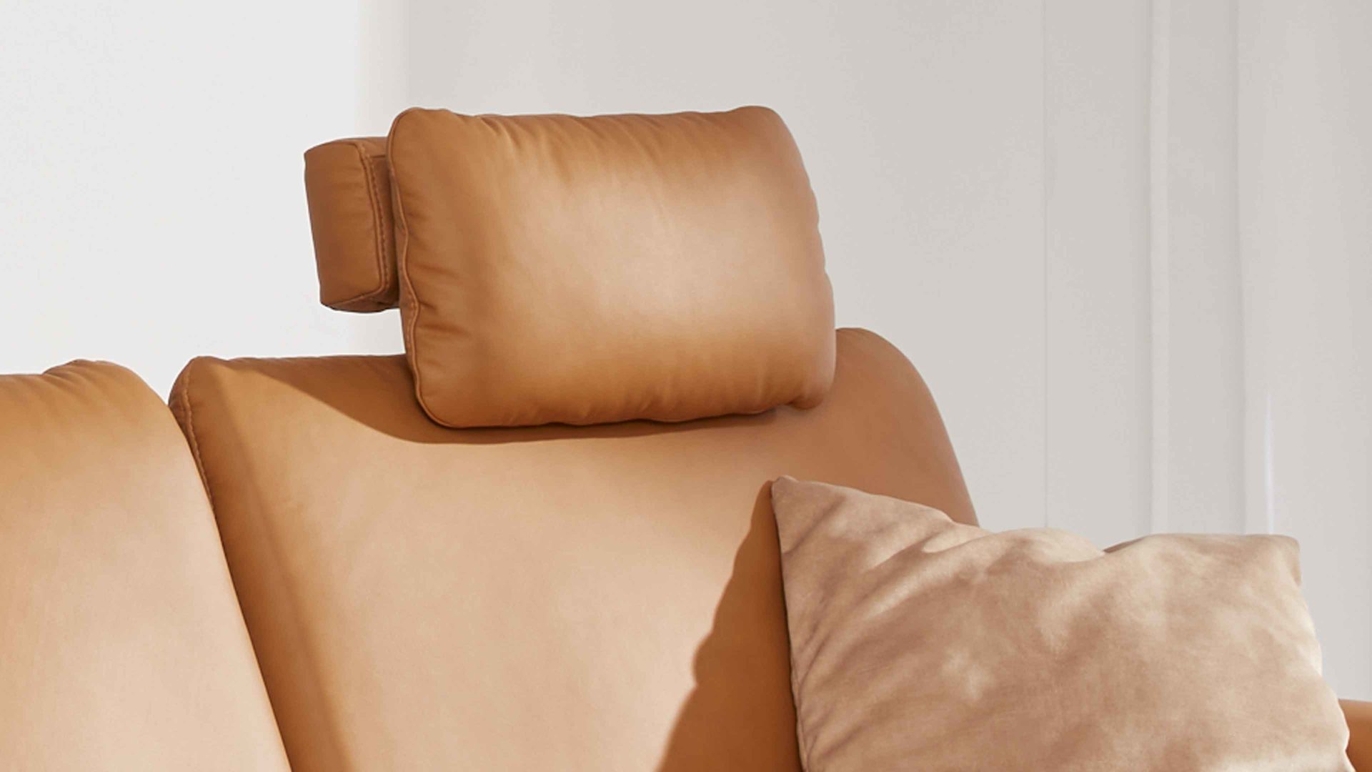 Die Premium-Kopfstütze PKSG fungiert als Mehrpreis-Zubehör für verschiedene Elemente aus dem Modulmaster-Polsterprogramm MM-PN1126. Sie ist mit kurkumafarben pigmentiertem Glattleder bezogen und mit einer Kopfstützenvorrichtung aus verchromtem Metall ausgestattet.