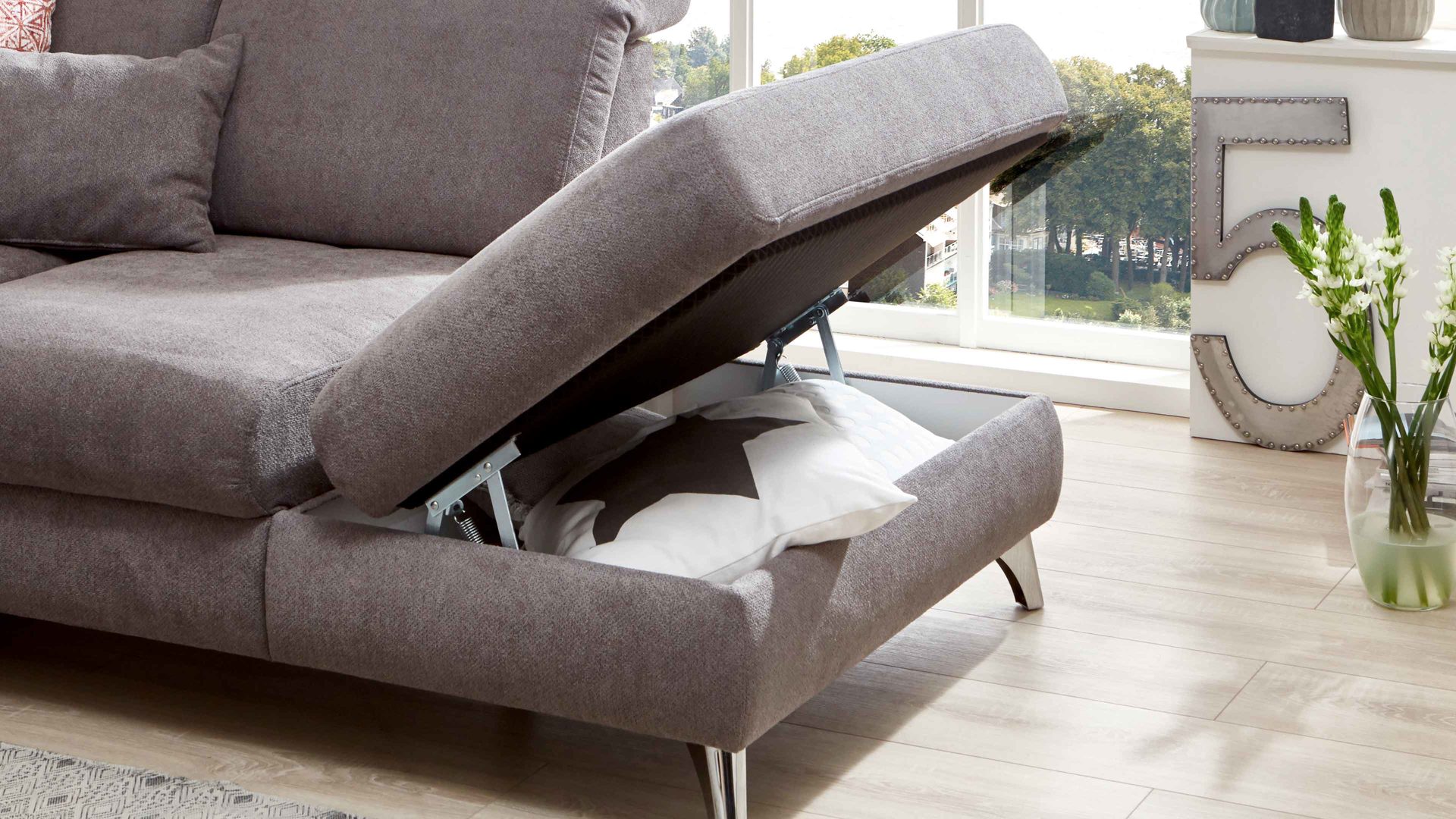 Die Polsterecke bietet mit einer hochwertigen PUR-Schaumpolsterung und praktischer Schwenkrückenfunktion hervorragenden Komfort.