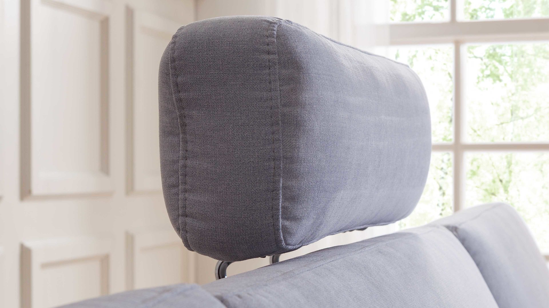 Mit dem hellblauen Veloursbezug Matrix strahlt sie moderne Eleganz aus und harmoniert perfekt mit den Polstermöbeln, die gleich bezogen sind. Die Vorrichtung aus verchromtem Metall, auf der das Kopfpolster befestigt ist, lässt sich auf der Rückenlehne des Sofas variabel einstecken. Der OEKO-TEX® zertifizierte Bezugstoff überzeugt durch seinen samtig weichen Griff und die pflegeleichte Strapazierfähigkeit.
