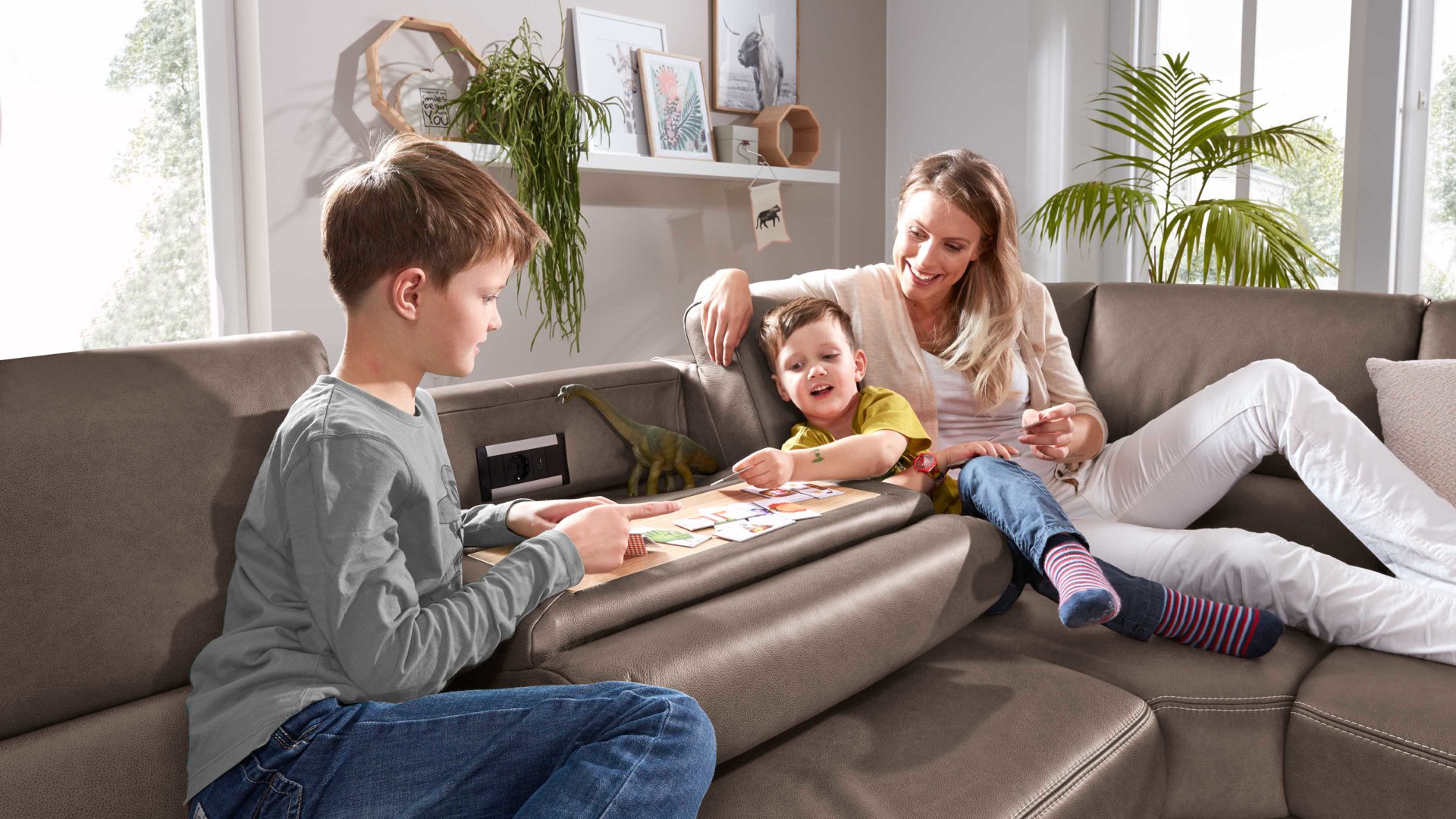 Indem Sie das Rückenpolster kurz mit einem Handgriff nach vorne klappen, offenbaren Sie eine praktische Ablagefläche, auf der Sie etwa bei einem Filmabend Gläser und Snacks platzieren können. Die Ablageplatte wird stets an den Farbton der Couchfüße angepasst. Als zusätzliches Highlight sind in den Rückenteil des Sofas Funktionsbuchsen - genauer gesagt eine Steckdose und ein USB-Anschluss - integriert. Somit können Sie hier auch bequem Ihr Mobiltelefon aufladen oder Ihr Notebook anschließen.