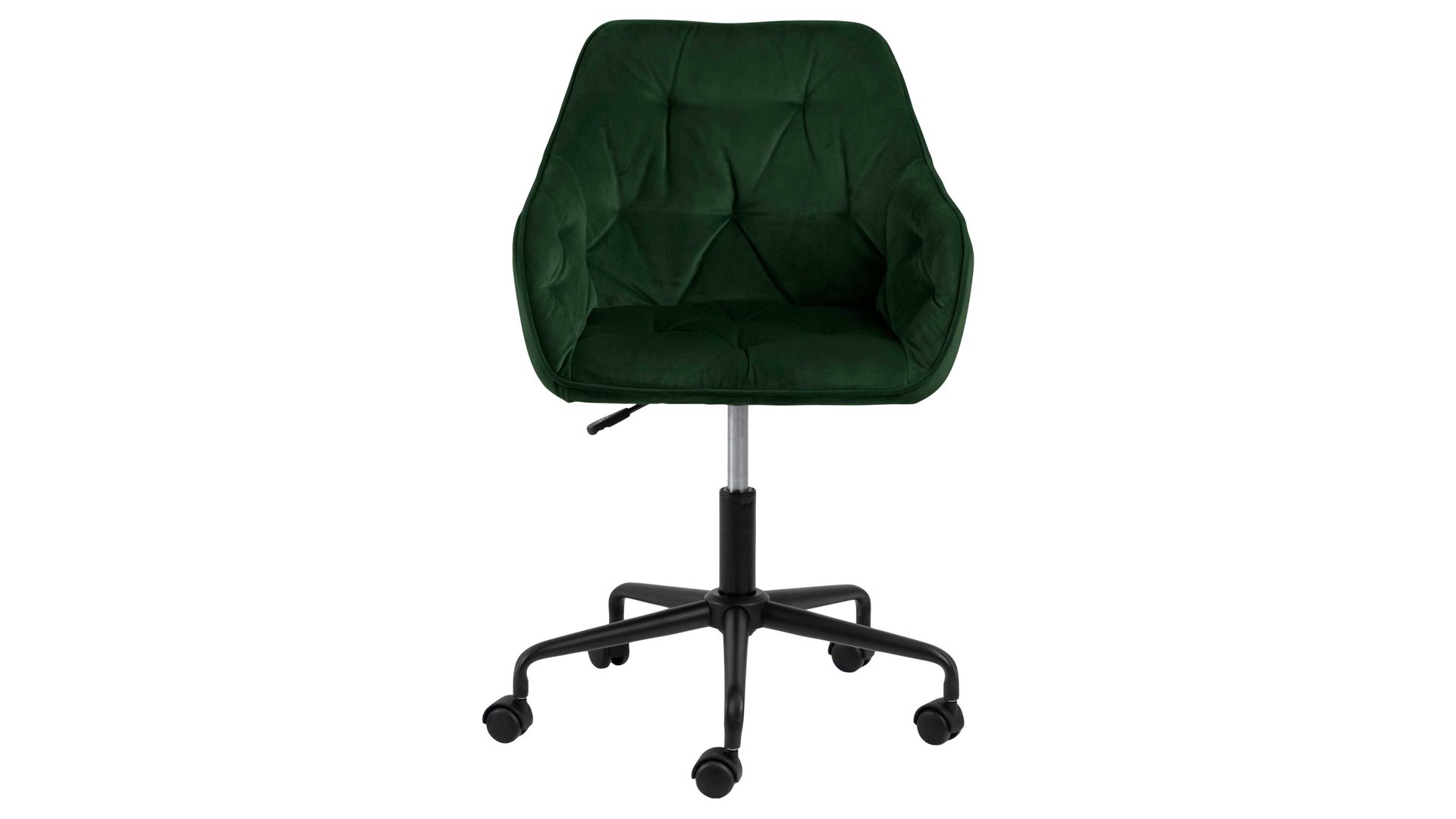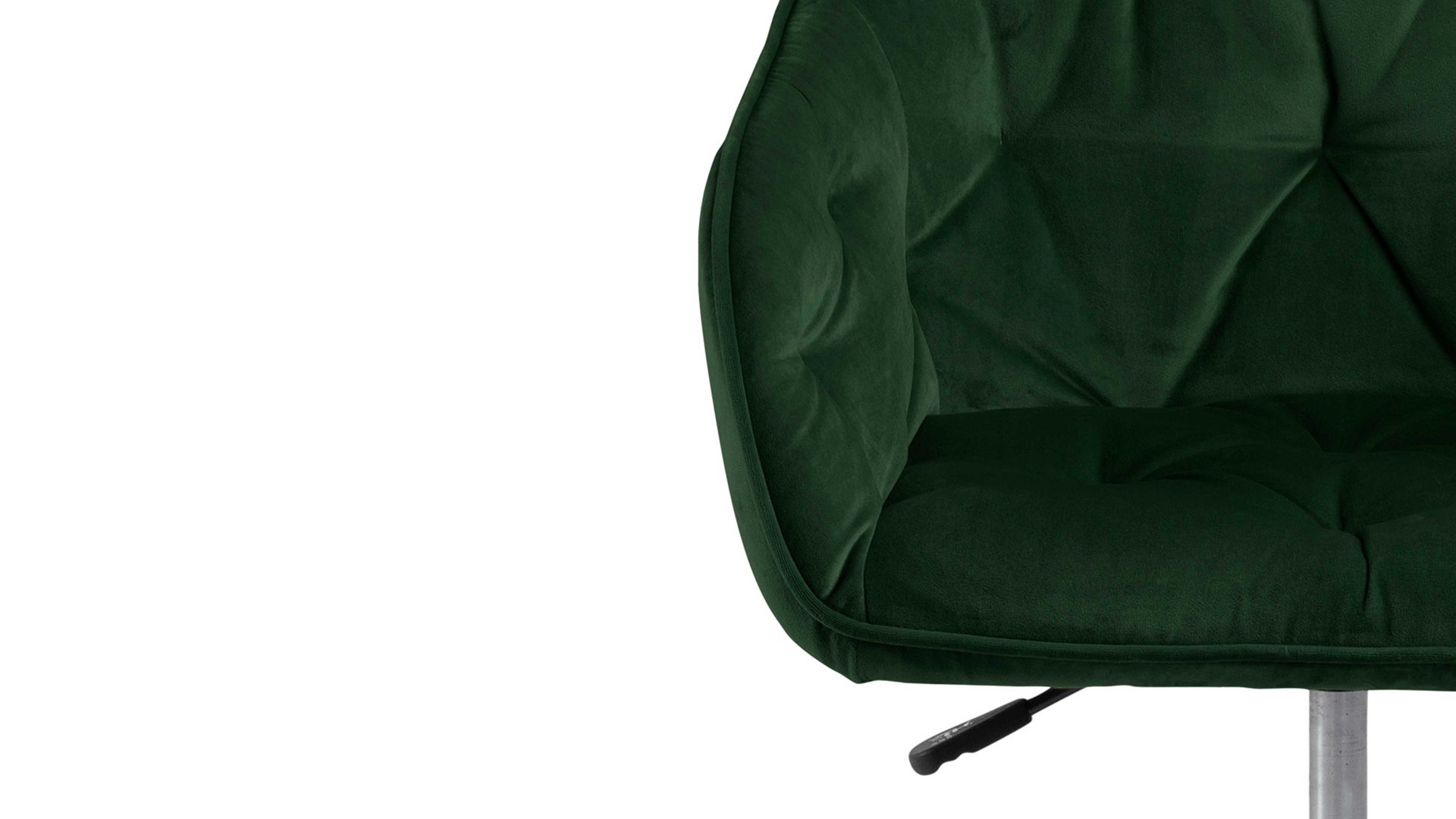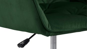 Dabei harmoniert der Drehstuhl in seiner sanften Formensprache mit zahlreichen Einrichtungsstilen: Dafür sorgt der waldgrüne Samtbezug, der die gesamte Sitzschale inklusive der bequemen Armlehnen weich umhüllt. Das pulverbeschichtete Metall-Drehkreuz fließt in mattem Schwarz stimmig in das Gesamtbild ein.