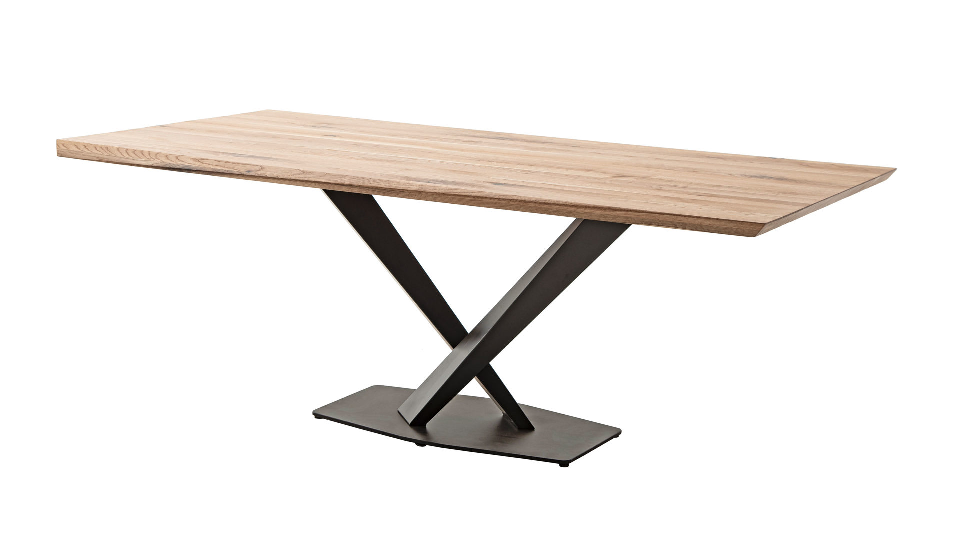 Tischplatte ca. 4 cm stark, aufgedoppelt, durchgehende Lamelle mit reverser Baumkante