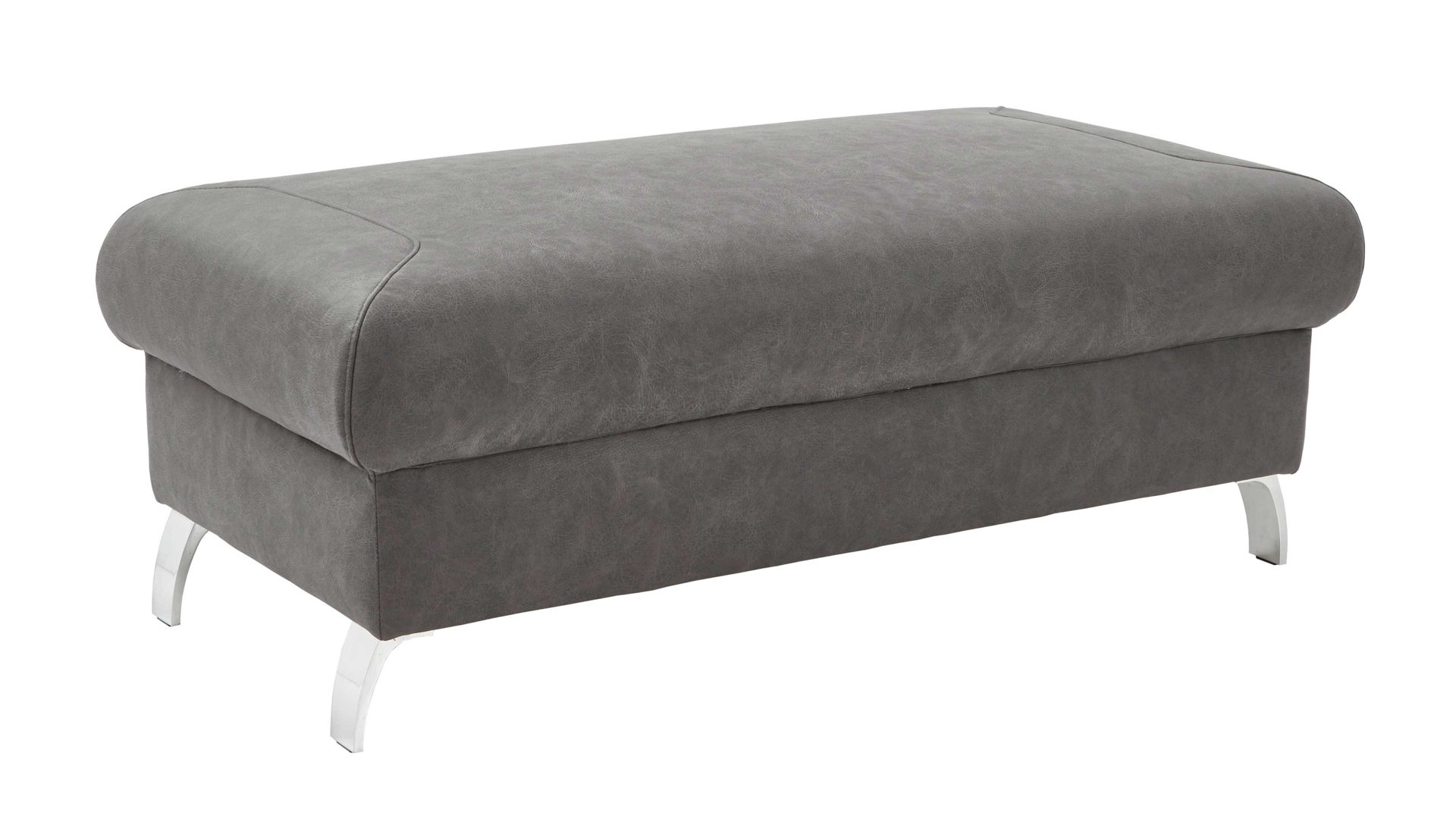 Bringen Sie mit dem Polsterhocker Rhodos Komfort und Eleganz in Ihr Wohnzimmer. Der anthrazitfarbene Stoffbezug Bulus strahlt eine warme und gemütliche Atmosphäre aus, während die silbernen Metallfüße für einen modernen Touch sorgen.