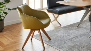der Softform-Stuhl mit Griffmulde in der Rückenlehne ist rundum glatt bezogen und bequem mit Formschaum auf Wellenunterfederung gepolstert