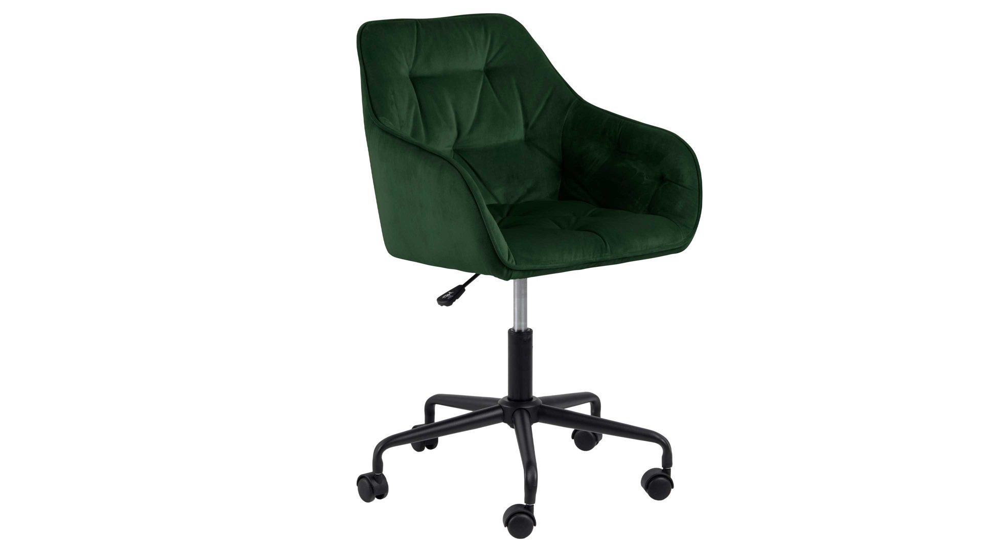 Dabei harmoniert der Drehstuhl in seiner sanften Formensprache mit zahlreichen Einrichtungsstilen: Dafür sorgt der waldgrüne Samtbezug, der die gesamte Sitzschale inklusive der bequemen Armlehnen weich umhüllt. Das pulverbeschichtete Metall-Drehkreuz fließt in mattem Schwarz stimmig in das Gesamtbild ein.