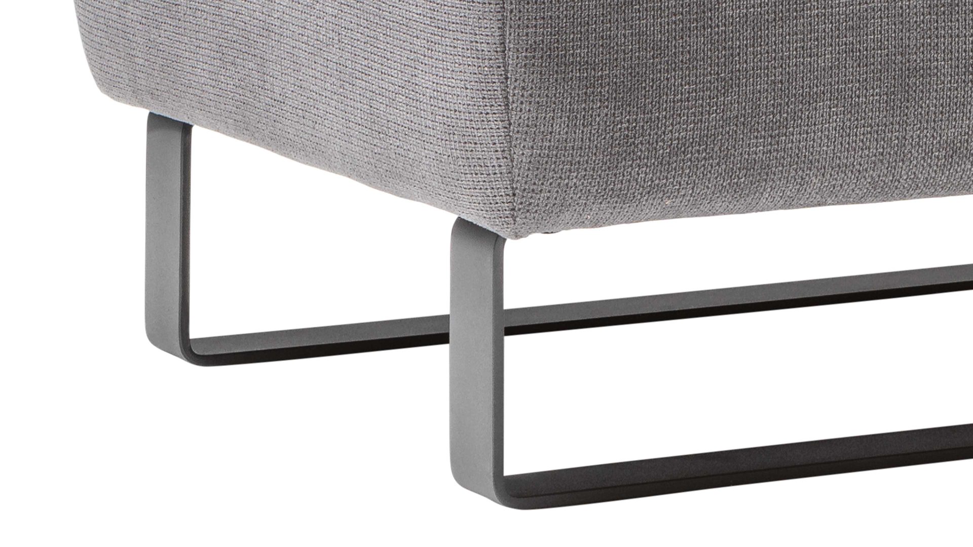 Der moderne Hocker Dana kombiniert einen stilvollen steinfarbenen Stoffbezug mit mattschwarz lackierten Metallkufen und strahlt schlichte Eleganz aus. Dadurch fügt er sich in unterschiedliche Wohnstile stimmig ein.