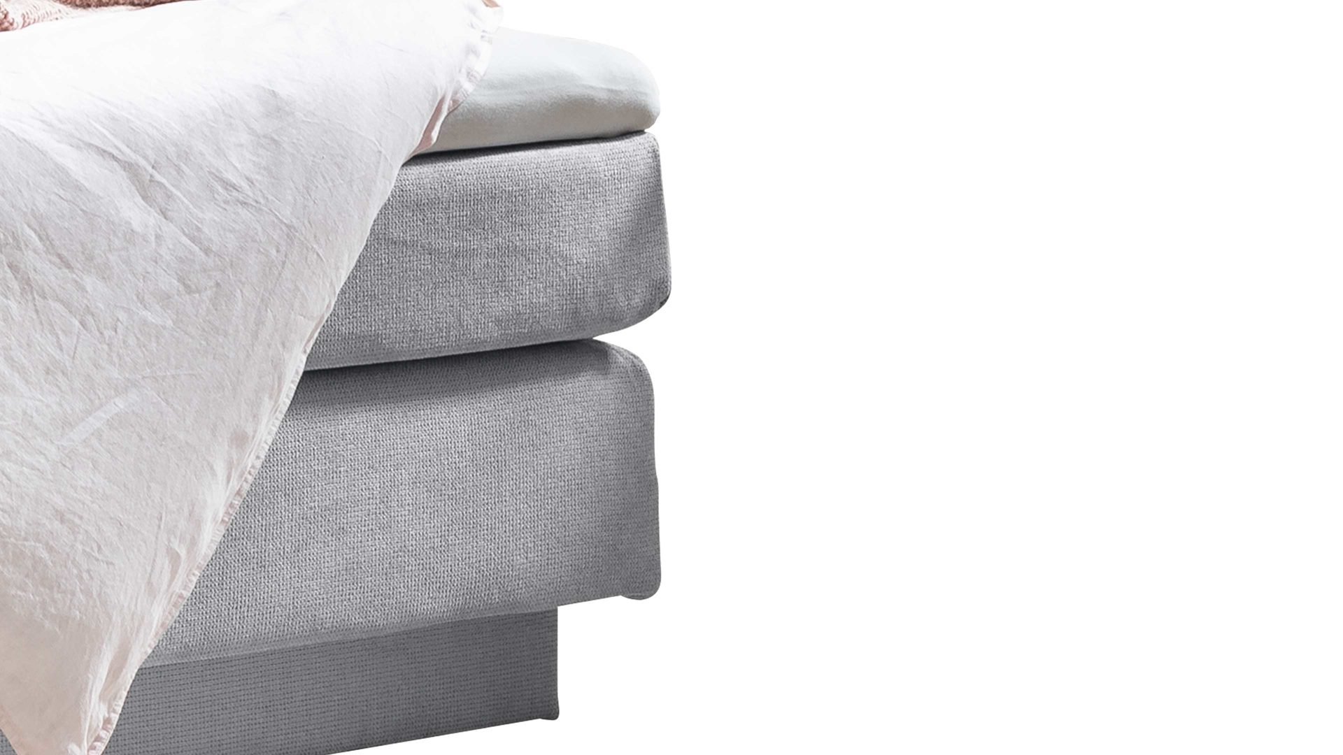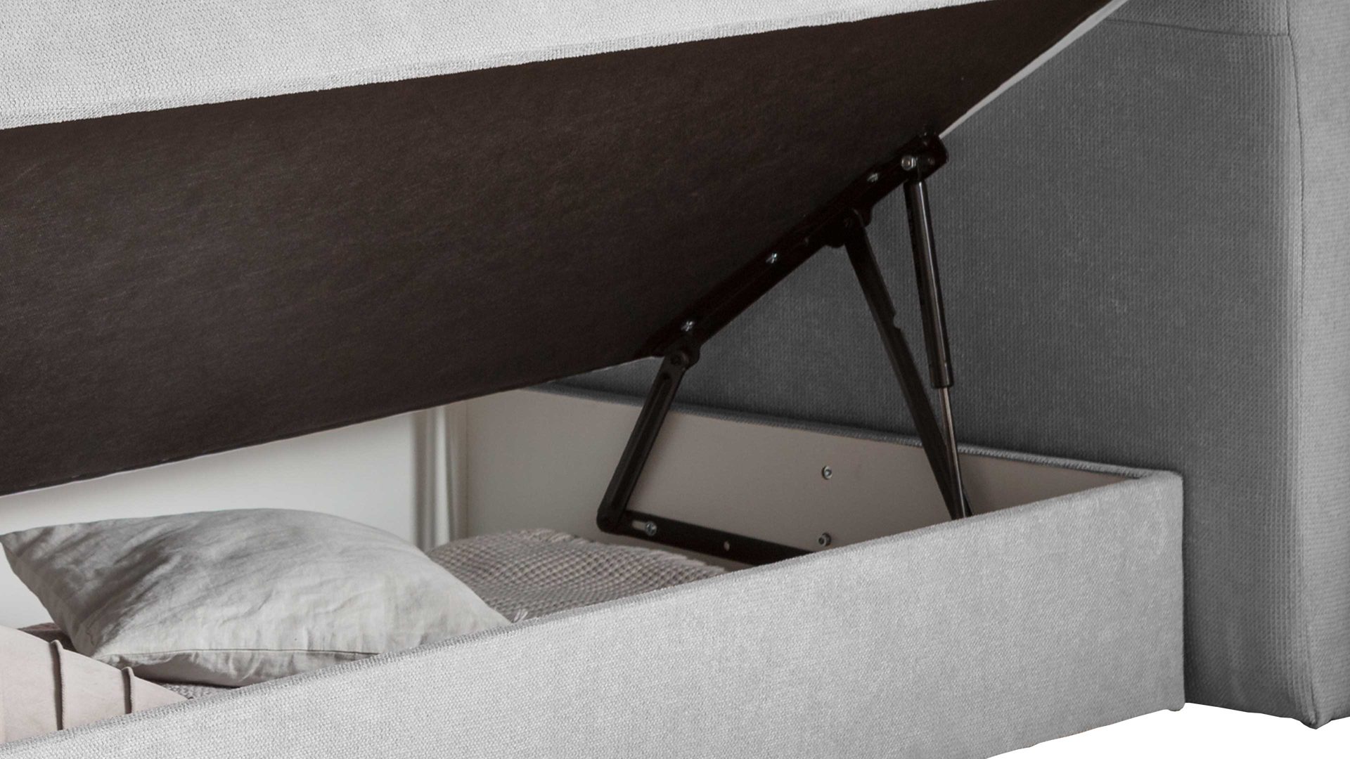Als Basis fungieren zwei Boxen mit Bonnellfederkernpolsterung. Sie sind jeweils rundum mit Möbelstoff bezogen. Zudem integrieren beide Boxen einen innen weiß beschichteten Bettkasten. Zum einfachen und sicheren Öffnen der praktischen Bettkästen sind jeweils zwei Gelenke mit Gasfedersystem verbaut.