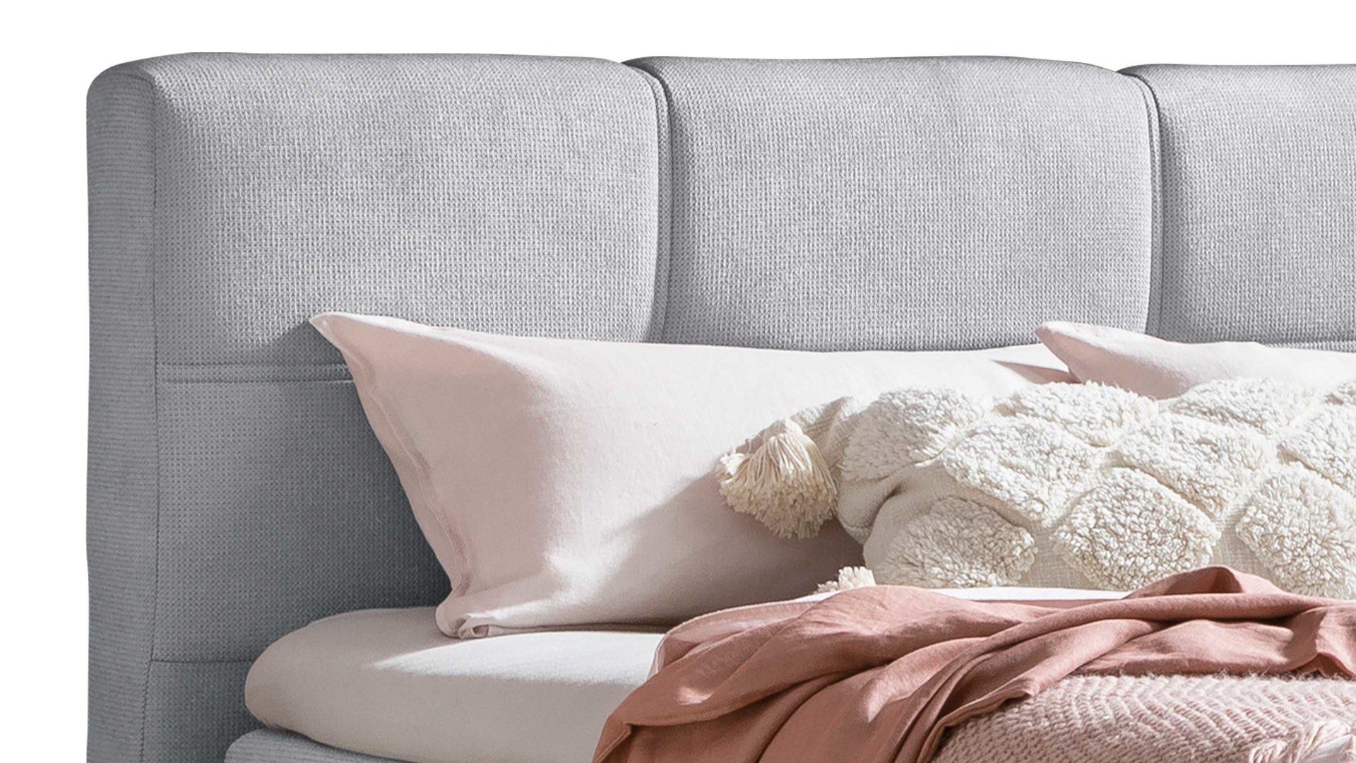Mit seinem stilvollen silbergrauen Stoffbezug strahlt das hochwertige Boxspringbett Portage moderne Eleganz aus. Ein optisches Highlight bildet auch das Polsterkopfteil mit den markanten Heftungen und Doppelziernähten. Die Rückseite ist mit Spinnvlies bezogen.