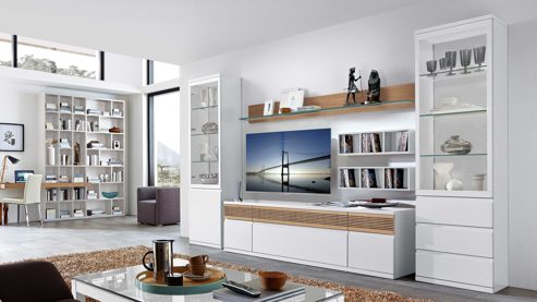 hartmann Serie Caya - Wohnwand mit Vitrinenschrank und Regalen