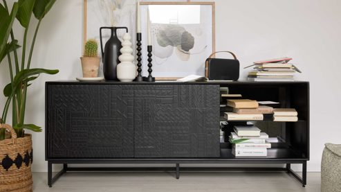 gebürstetes schwarz gebeiztes und lackiertes Mangoholz, kombiniert mit schwarz lackiertem MDF, Klarglas und schwarzem Metall