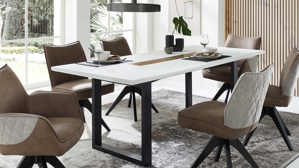 mattweiße Tischplatte, kombiniert mit Artisan Eiche-Nachbildung und mattschwarzem Metall