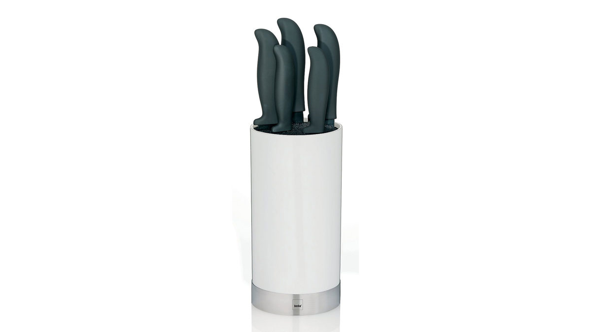 Praktisch und stilvoll zugleich: der Messerblock Acida von kela. Dieser beinhaltet fünf verschiedene qualitativ hochwertige Messer, von klein bis groß, die aus Edelstahl gefertigt sind. Der Messerblock ist aus weißem PP-Kunststoff gefertigt. Dieser hat zudem ein praktisches Innenleben, das einfach herausnehmbar ist. Die Messer sind durch dünne Kunststoff-Streifen im Messerblock voneinander getrennt und können somit nicht so leicht verkratzen. Maße ca. 11 x 23 cm (DxH) mit 1 x Chefmesser ca. 32 cm (L), 1 x Fleischmesser ca. 32 cm (L), 1 x Brotmesser ca. 32 cm (L), 1 x Ausbeinmesser ca. 24 cm (L), 1 x Küchenmesser ca. 20 cm (L)
