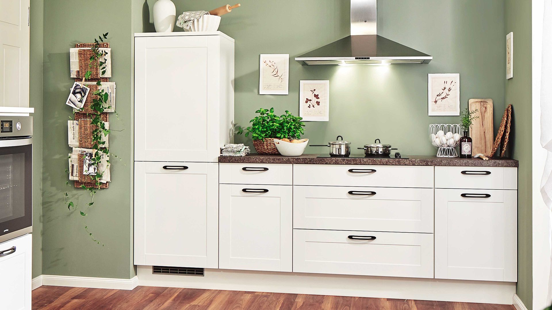 Die Highlights der individuell planbaren Küche sind der hochgebaute Backofen und die zahlreichen Auszüge mit extra viel Stauraum. Optional können Sie eine Armatur für die Einbauspüle und eine Geschirrspülmaschine für eine bequemere Geschirrreinigung ergänzen. Die hochwertige Einbauküche ist Made in Germany.