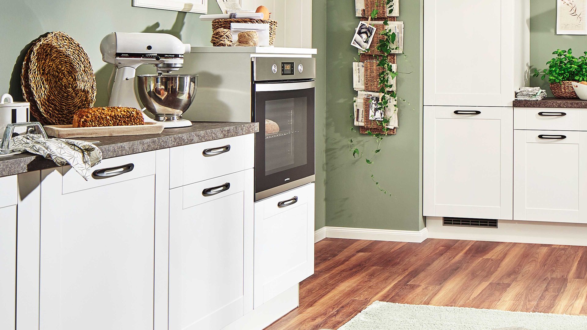 Diese pino Einbauküche kombiniert mattweiße Fronten mit weißen Korpussen und Sockelblenden. Einen stilvollen Akzent setzen die Arbeitsplatten in graubrauner Granit-Nachbildung. Edle Bügelgriffe runden die modern-elegante Optik perfekt ab.