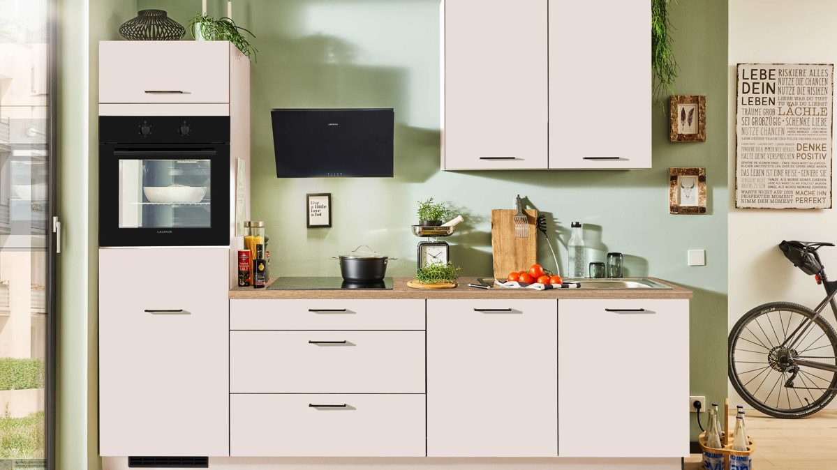 Küchenzeile mit hochwertiger Edelstahl-Einbauspüle und kopffreier Dunsthaube, Länge ca. 270 cm