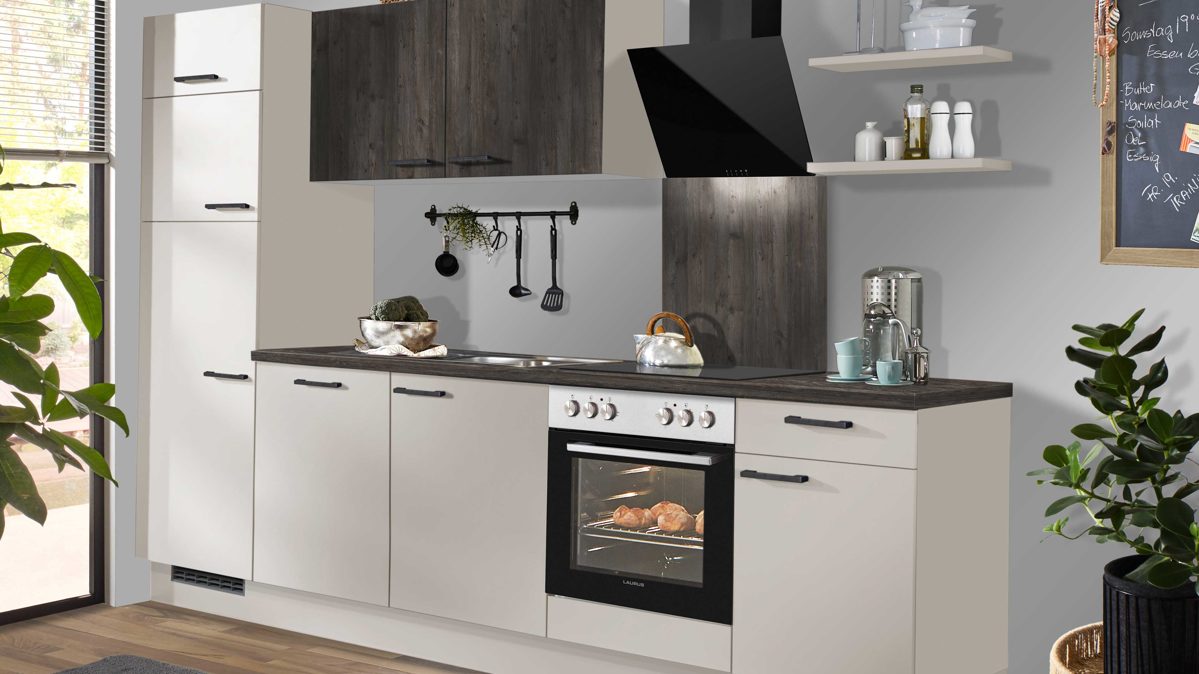 Küchenzeile mit starekn Akzentfronten, hochwertiger Edelstahl-Einbauspüle und Nischenverkleidung, Länge ca. 290 cm