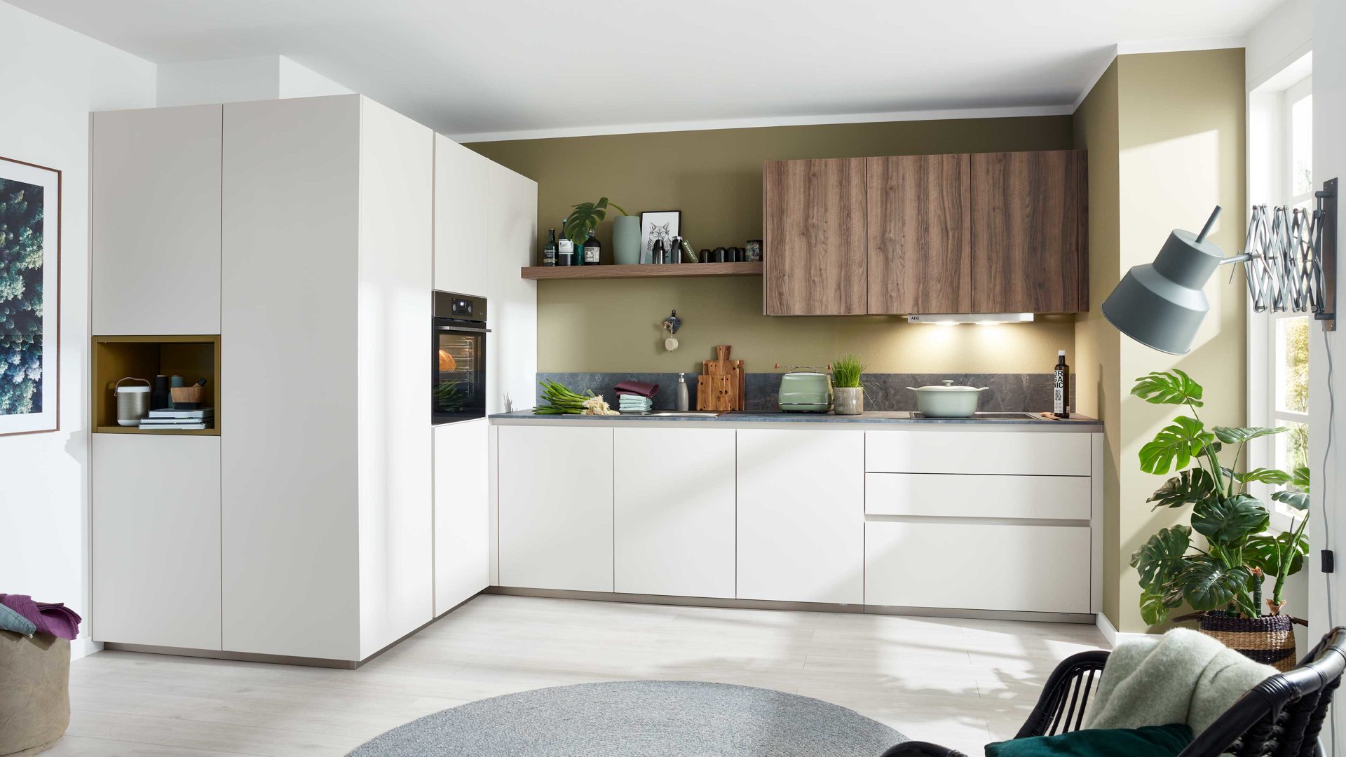 Die WERT KÜCHE® Franziska kombiniert matte muschelweiße Fronten mit einem Hängeschrank und Regalelementen in warmer Victoria Nussbaum-Nachbildung. Einen attraktiven Akzent setzt die Arbeitsplatte in trendigem Atlantic Graphit. Weiße Sockelblenden und edelstahlfarbene Griffmulden runden das moderne Design harmonisch ab.