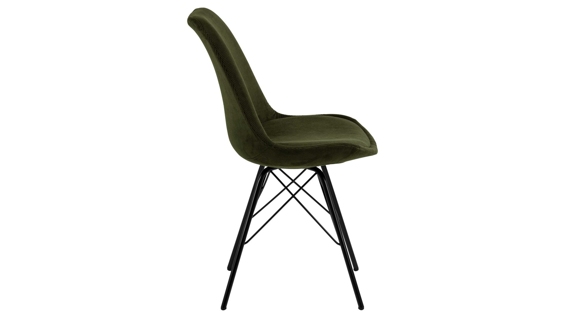 Der Polsterstuhl Eris verkörpert klassische Eleganz. Als stabile, dabei aber wunderbar filigran designte Basis fungiert ein mattschwarz pulverbeschichtetes Stahldrahtgestell. Darauf befindet sich eine olivgrüne Sitzschale aus robustem Kunststoff. Sie ist rundherum mit Feincord bezogen, ebenfalls in Olivgrün. Der angesagte Feincordbezug überzeugt sowohl qualitativ als auch optisch und haptisch.
