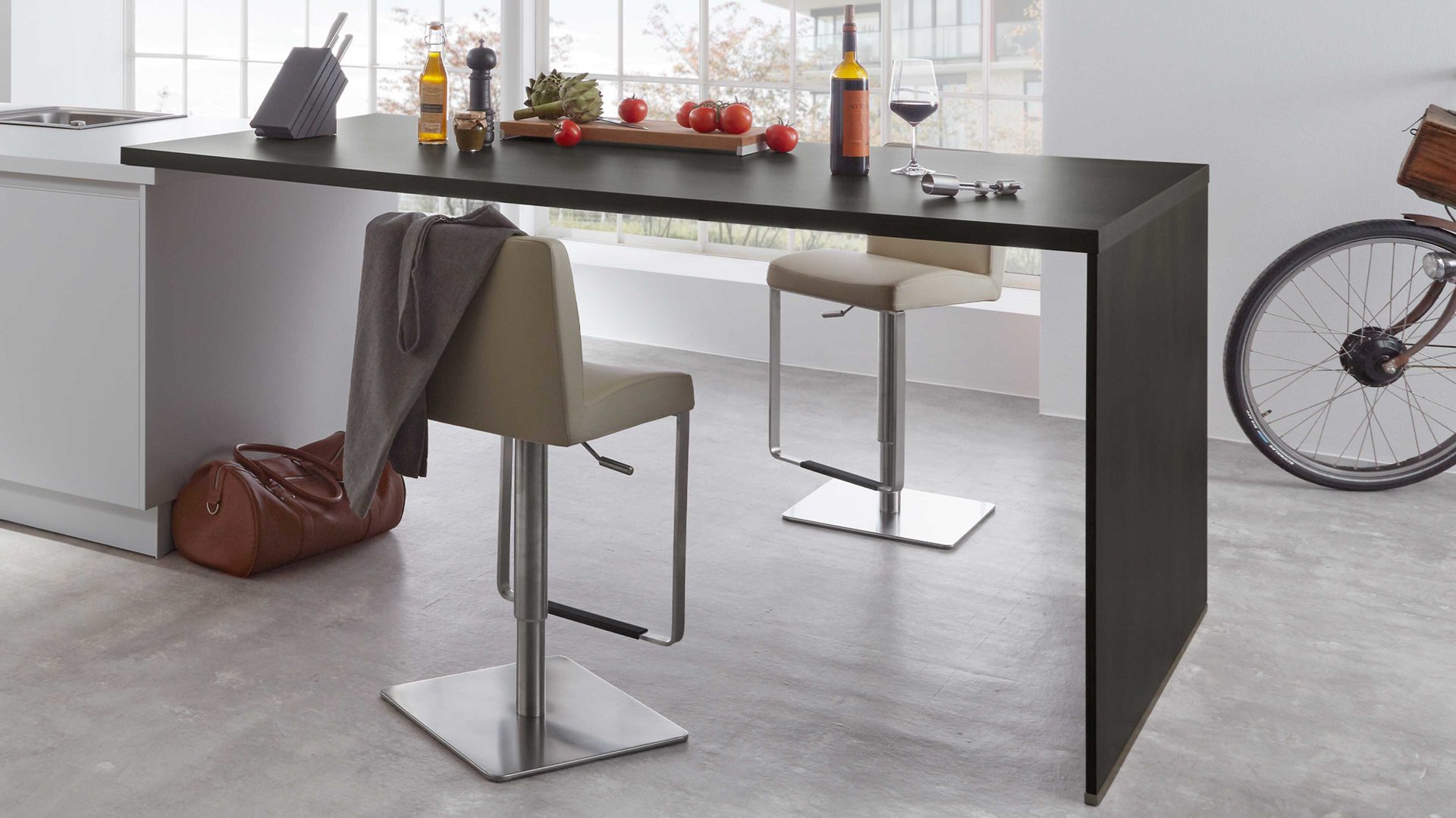 Sie kombiniert kristallweiße mit dunkler Stahl-Nachbildung. Durch die weiße Arbeitsplatte, den dunkel Stahlfarbenen Ansetztisch sowie die in Kristallweiß und dunkler Stahl-Nachbildung gehaltenen Sockelblenden werden die Küchenmöbel absolut harmonisch abgerundet. Akzente setzen die schwarzen Griffleisten.