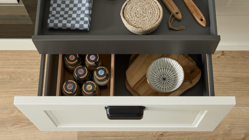 Die moderne Landhaus-Küchenzeile bietet auf einer Länge von ca. 460 cm großzügige Arbeitsflächen und clevere Stauraumlösungen. Neben offenen Regalböden und einer dekorativen Nischenverkleidung sorgen zwei große Aufbewahrungskörbe mit culineo®-Logo für einen charmanten, wohnlichen Akzent. Dieses Konzept schafft ein einladendes Ambiente, das klassische Details mit modernem Komfort vereint.