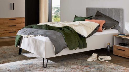 Das Programm ist flexibel anpassbar und sogar mit Maßkürzungen in Höhe, Breite und Tiefe erhältlich. Durchdachte Stauraumlösungen mit variablen Schrankbreiten, cleveren Innenausstattungen und praktischem Zubehör sorgen für Ordnung im Alltag. Ergänzend lassen sich ergonomische Arbeitsbereiche planen – optional auch mit höhenverstellbarem Schreibtisch. Unterschiedliche Bettgestelle, Stauraum-, Duo- oder Kastenliegen ermöglichen maximale Flächennutzung.