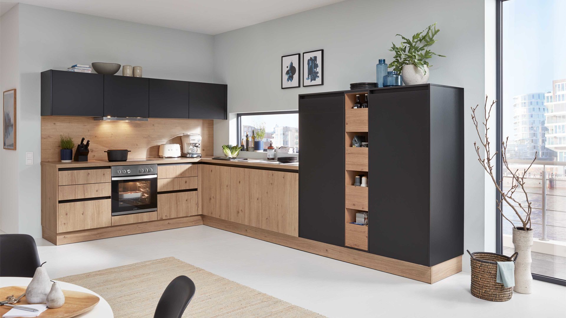 Die WERT KÜCHE® Biella strahlt moderne Eleganz gepaart mit klassischem, warmem Charme aus. Sie kombiniert Satin lavaschwarze Lackoberflächen mit Alteiche Provence-Nachbildung. Durch die ebenfalls alteichefarbene Gestaltung der Arbeitsplatten und des Ansetztisches werden die Küchenmöbel absolut harmonisch abgerundet. Akzente setzen die edelstahlfarbenen Sockelblenden und Griffleisten.
