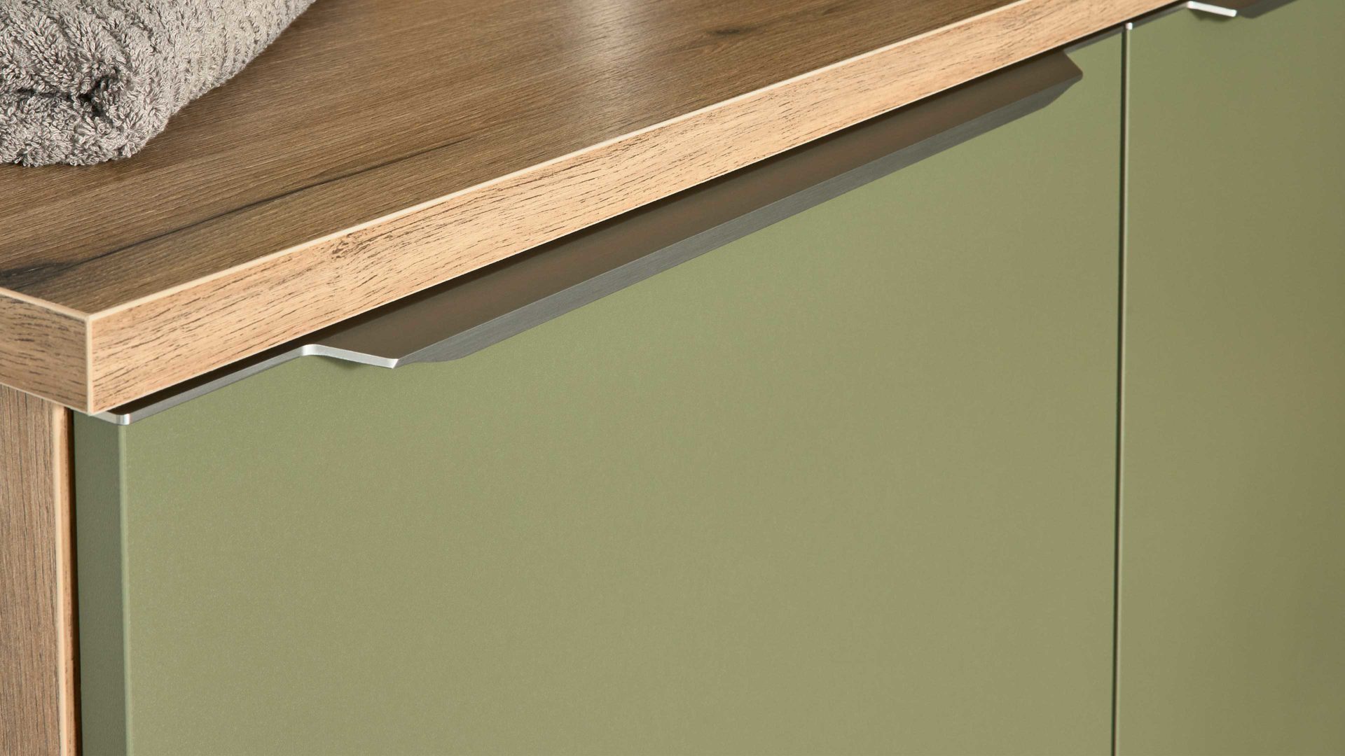 Die Interliving Küche Serie 3074 zeigt, dass auch ein Hauswirtschaftsraum mehr sein kann als nur Stauraum. Mit ihren softmatten olivgrünen Fronten strahlt sie Wärme und Natürlichkeit aus, während die authentische Vulkaneiche-Nachbildung an Sockelblenden, Regalen und Nischenverkleidung für wohnlichen Charakter sorgt. Dezente Metallgriffe runden das harmonische Gesamtbild im beliebten Natural-Living-Stil stilvoll ab.