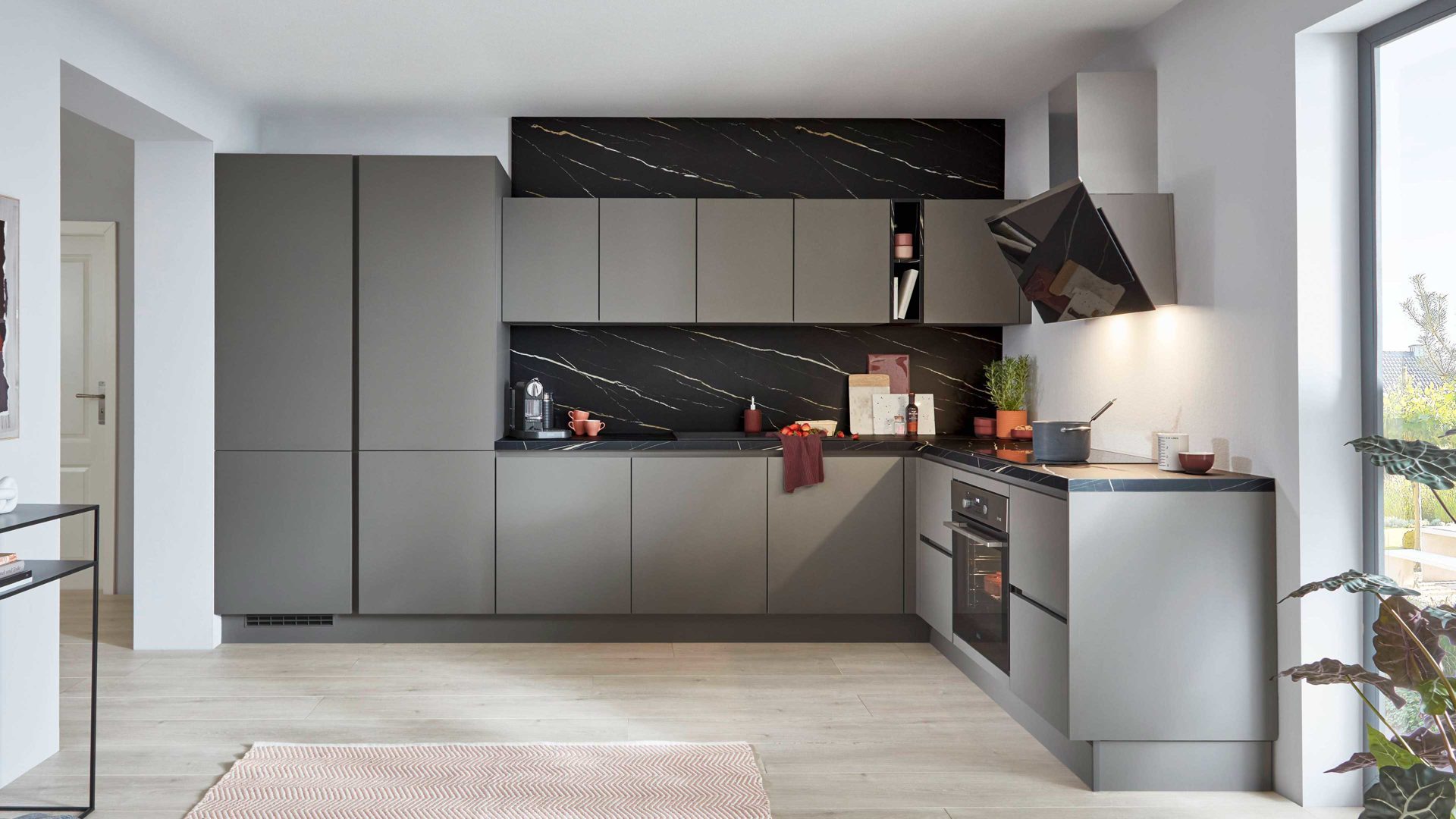 Die nobilia® Einbauküche Laser überzeugt mit mattem Taupegrau und integrierten dunkelgrauen Griffmulden, die das reduzierte Design unterstreichen. Arbeitsplatten und Nischenverkleidung in Venato Nero Marmor-Nachbildung setzen einen ausdrucksstarken Akzent und verleihen der Küche eine edle, moderne Note.