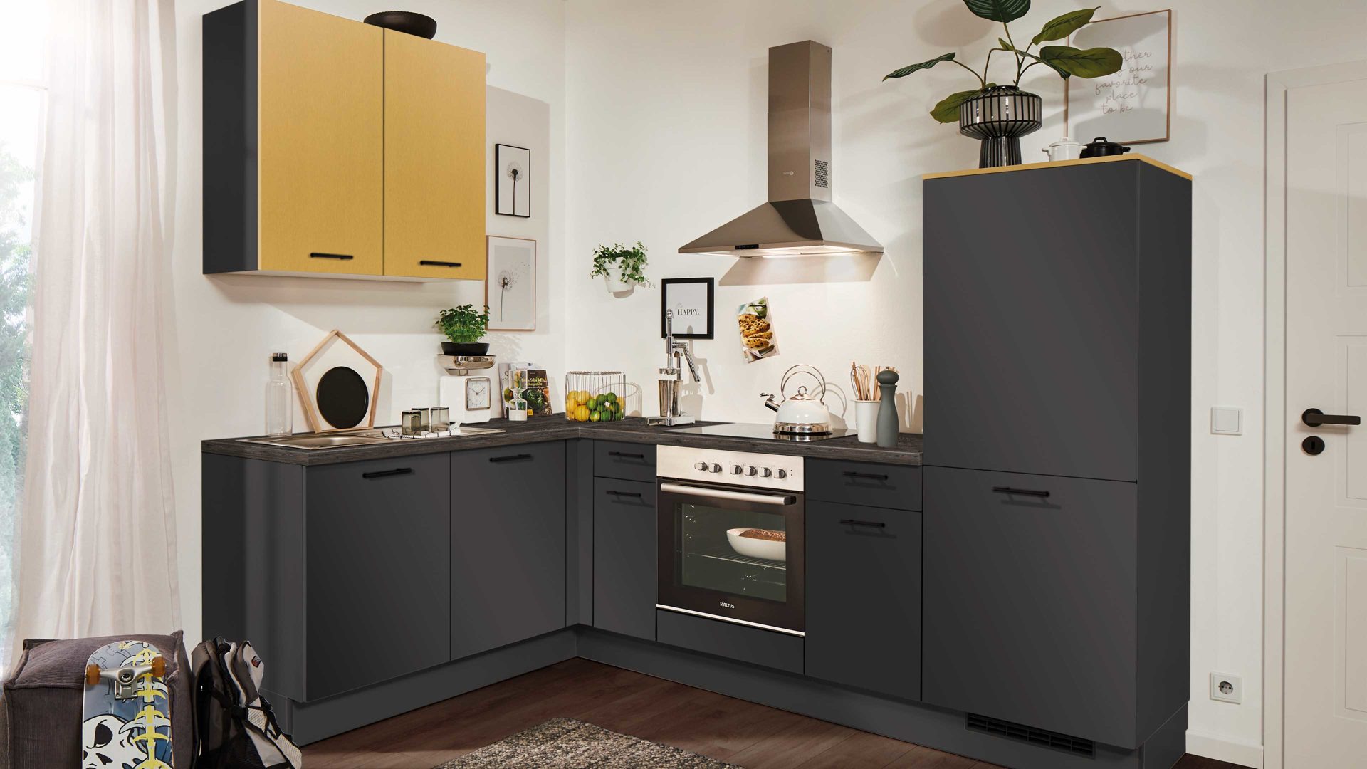 supermattes Grafit, kombiniert mit Alux Gold, schwarzen Metall-Bügelgriffen und Arbeitsplatten in Hemlock Lava