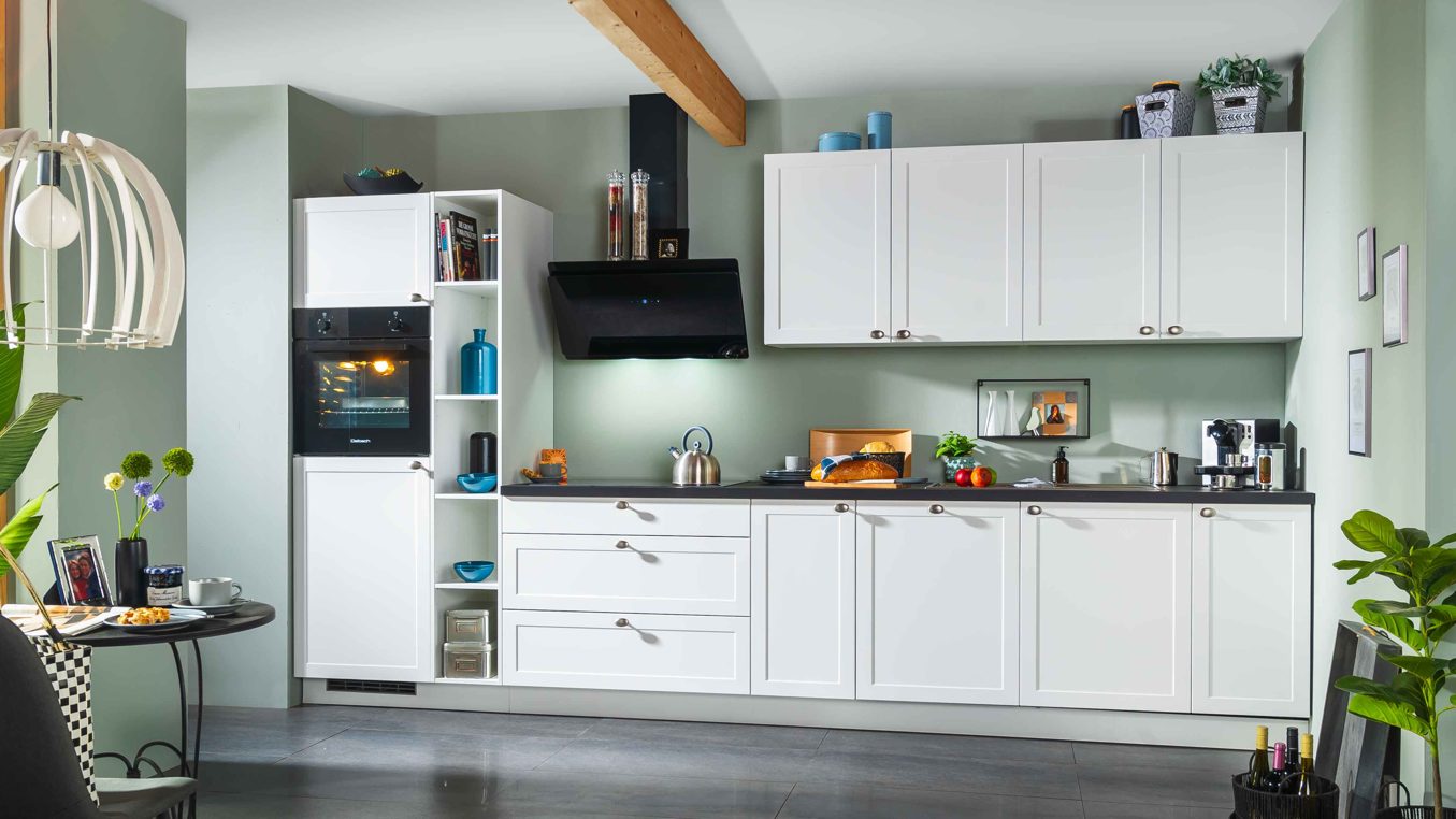 mattweiße Lacklaminatfronten, kombiniert mit schwarzer Steinstruktur-Nachbildung
