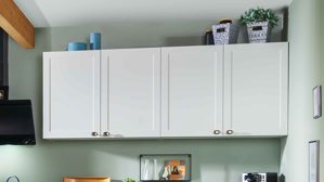 kopffreie Dunsthaube über einem ca. 80 cm breiten Kochfeld und Hängeschränke